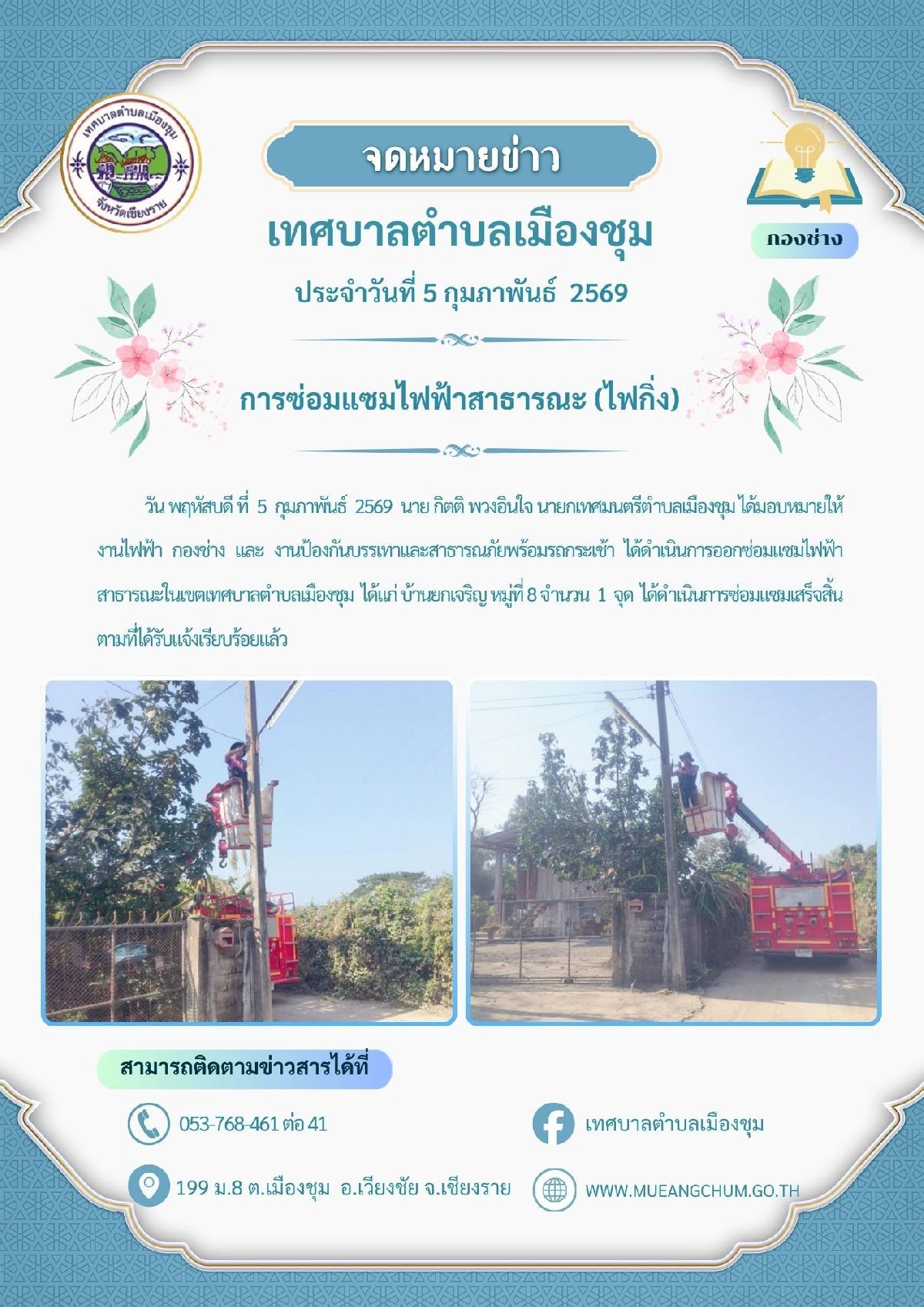 ได้ดำเนินการออกซ่อมแซมไฟฟ้าสาธารณะในเขตเทศบาลตำบลเมืองชุม ได้แก่ บ้านยกเจริญ