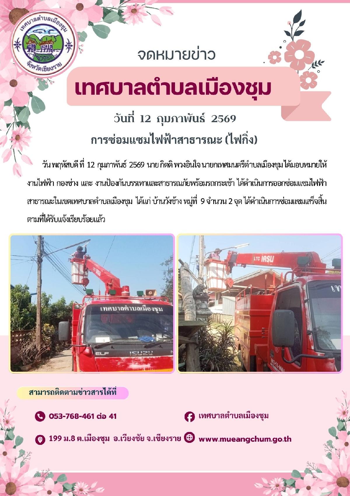 วัน พฤหัสบดี ที่ 12 กุมภาพันธ์ 2569 นาย กิตติ พวงอินใจ นายกเทศมนตรีตำบลเมืองชุม ได้มอบหมายให้