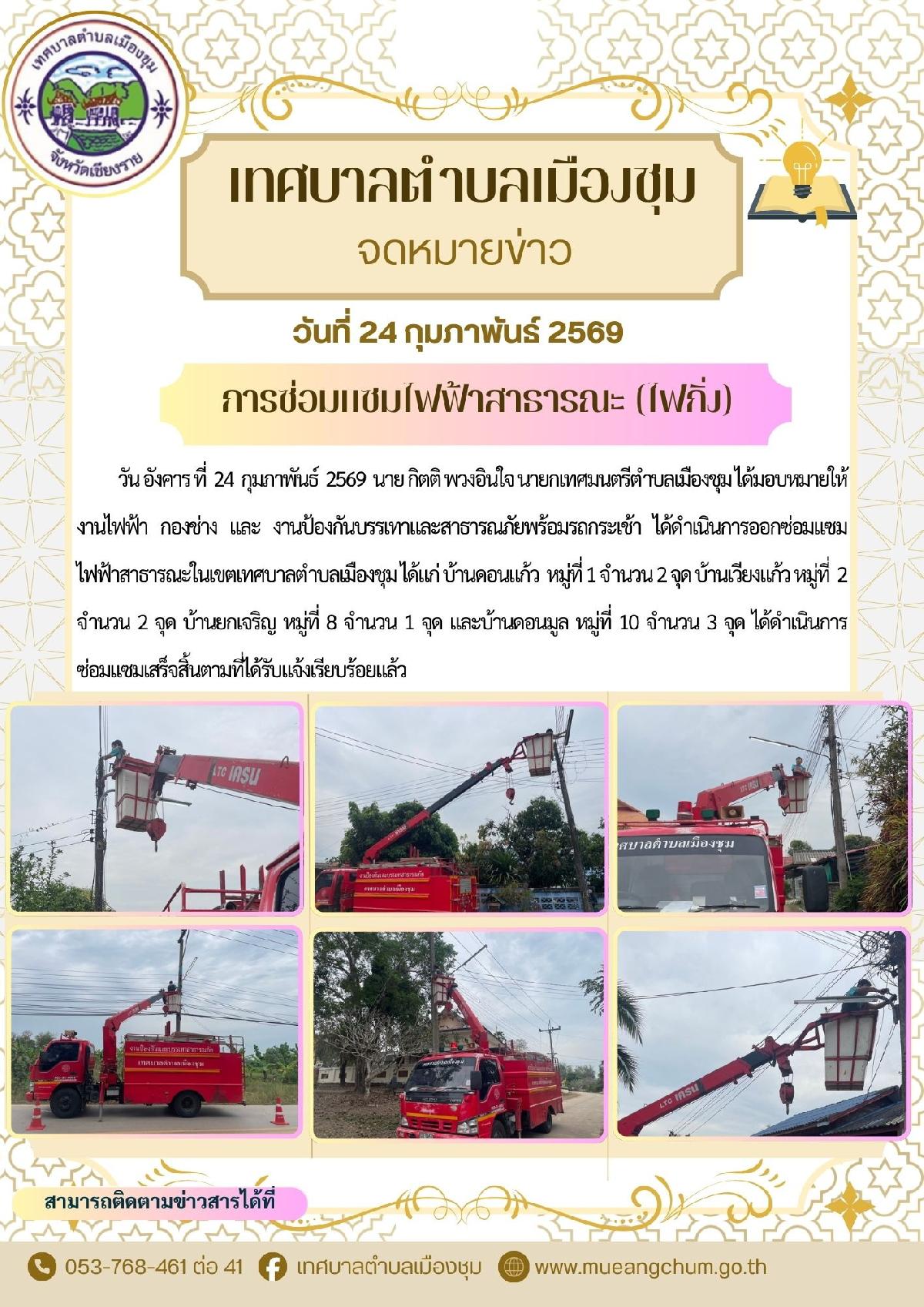 ได้ดำเนินการออกซ่อมแซมไฟฟ้าสาธารณะในเขตเทศบาลตำบลเมืองชุม ได้แก่ บ้านดอนแก้ว