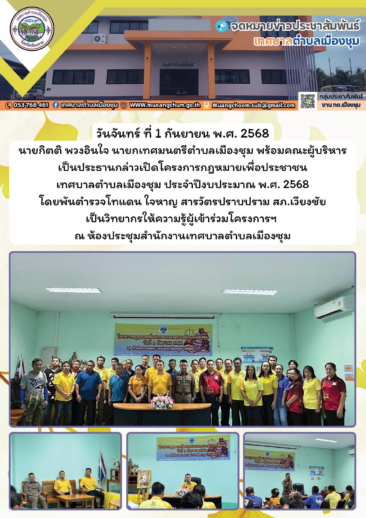โครงการอบรมเรื่องควบคุม ป้องกัน และเฝ้าระวังไข้เลือดออก ดำเนินโครงการฯ โดย กลุ่ม อสม.ตำบลเมืองชุม สนับสนุนโดยกองทุนหลักประกันสุขภาพในระดับท้องถิ่นหรือพื้นที่เทศบาลตำบลเมืองชุม (สปสช.)