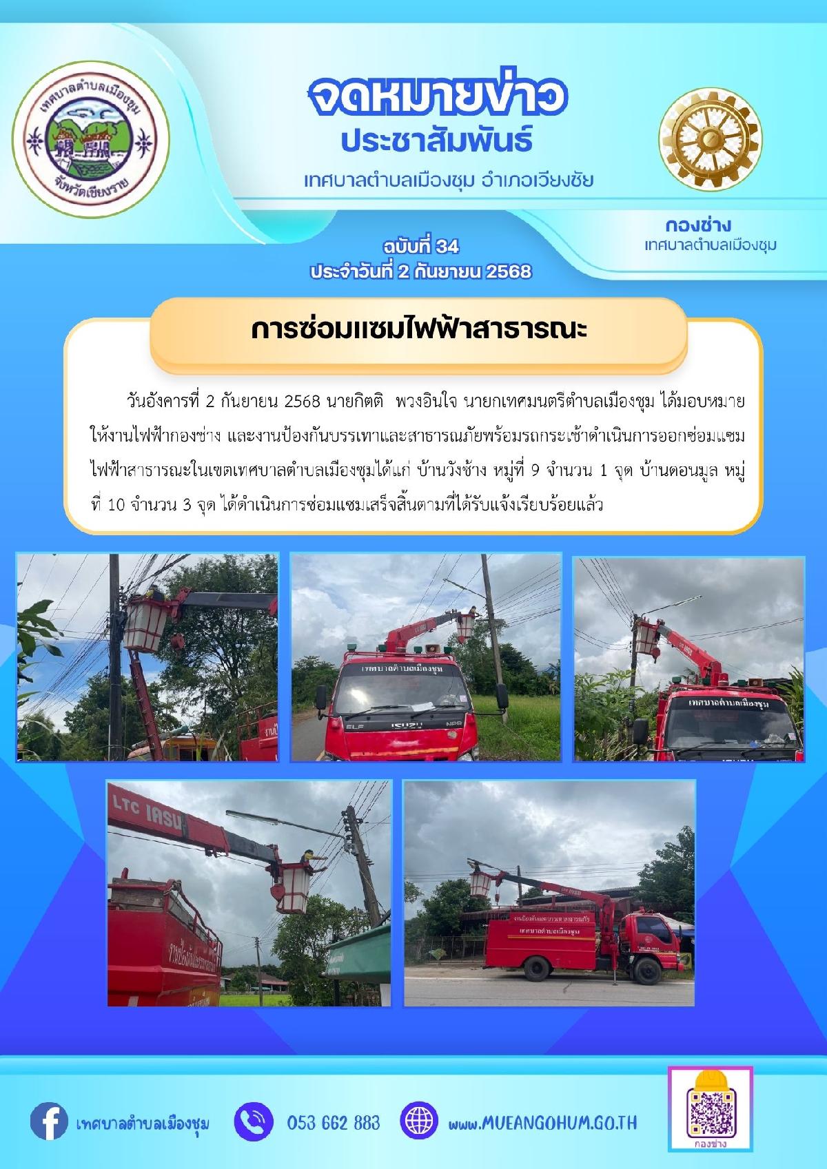 วันอังคารที่ 2 กันยายน 2568 นายกิตติ พวงอินใจ นายกเทศมนตรีตำบลเมืองชุม ได้มอบหมายให้งานไฟฟ้ากองช่าง และงานป้องกันบรรเทาและสาธารณภัยพร้อมรถกระเช้าดำเนินการออกซ่อมแซมไฟฟ้าสาธารณะในเขตเทศบาลตำบลเมืองชุมได้แก่ บ้านวังช้าง หมู่ที่ 9 จำนวน 1 จุด บ้านดอนมูล หมู่ที่ 10 จำนวน 3 จุด ได้ดำเนินการซ่อมแซมเสร็จสิ้นตามที่ได้รับแจ้งเรียบร้อยแล้ว