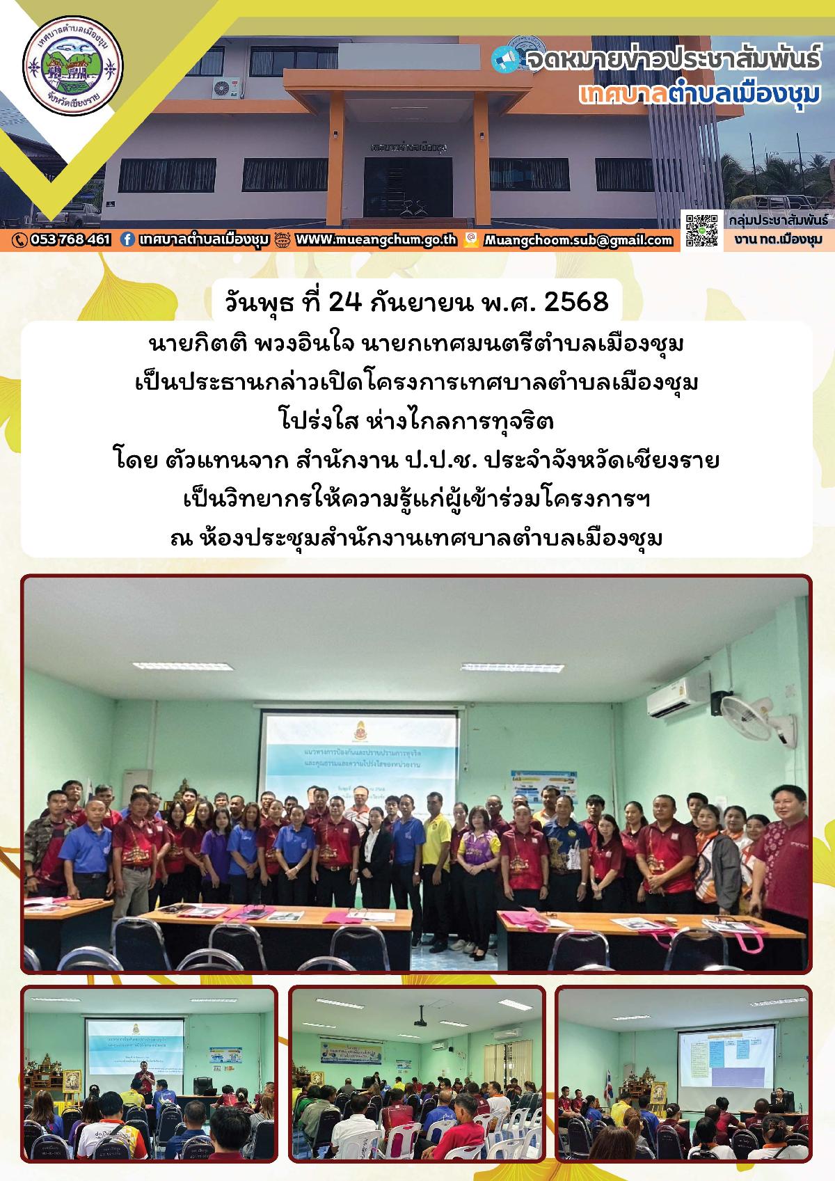 โครงการอบรมเรื่องควบคุม ป้องกัน และเฝ้าระวังไข้เลือดออก ดำเนินโครงการฯ โดย กลุ่ม อสม.ตำบลเมืองชุม สนับสนุนโดยกองทุนหลักประกันสุขภาพในระดับท้องถิ่นหรือพื้นที่เทศบาลตำบลเมืองชุม (สปสช.)