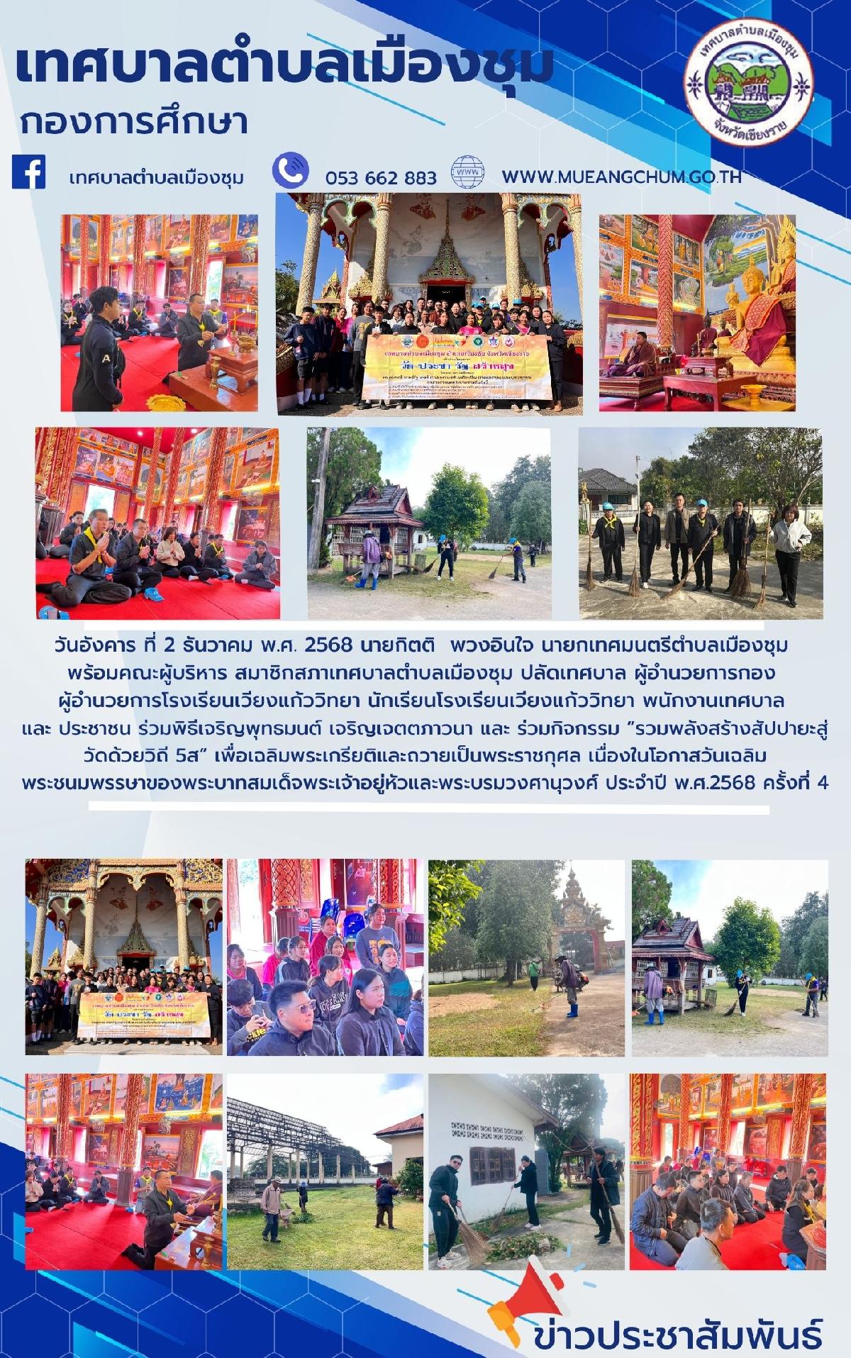 วันอังคาร ที่ 2 ธันวาคม พ.ศ. 2568 นายกิตติ พวงอินใจ นายกเทศมนตรีตำบลเมืองชุม พร้อมคณะผู้บริหาร สมาชิกสภาเทศบาลตำบลเมืองชุม ปลัดเทศบาล ผู้อำนวยการกอง ผู้อำนวยการโรงเรียนเวียงแก้ววิทยา นักเรียนโรงเรียนเวียงแก้ววิทยา พนักงานเทศบาล และ ประชาชน ร่วมพิธีเจริญพุทธมนต์ เจริญเจตตภาวนา และ ร่วมกิจกรรม “รวมพลังสร้างสัปปายะสู่วัดด้วยวิถี 5ส” เพื่อเฉลิมพระเกรียติและถวายเป็นพระราชกุศล เนื่องในโอกาสวันเฉลิมพระชนมพรรษาของพระบาทสมเด็จพระเจ้าอยู่หัวและพระบรมวงศานุวงศ์ ประจำปี พ.ศ.2568 ครั้งที่ 4