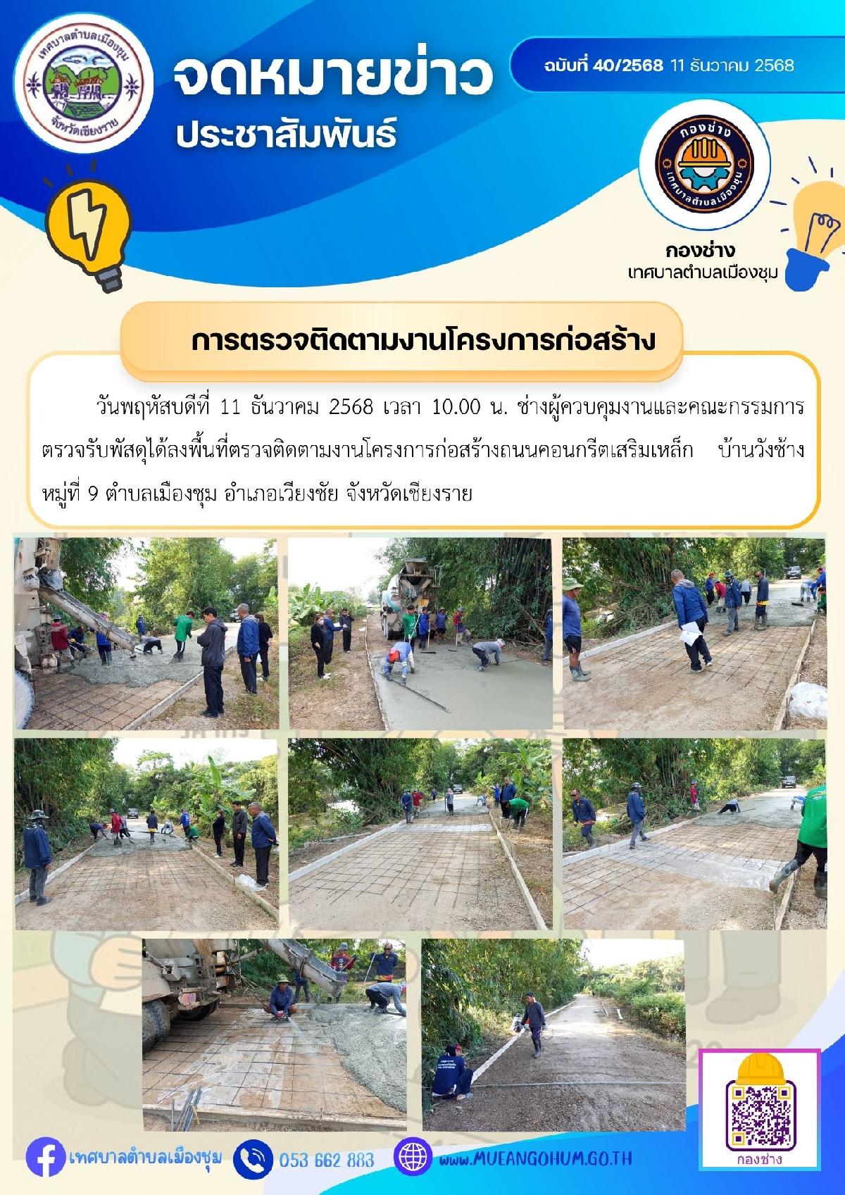 วันพฤหัสบดีที่ 11 ธันวาคม 2568 เวลา 10.00 น. ช่างผู้ควบคุมงานและคณะกรรมการตรวจรับพัสดุได้ลงพื้นที่ตรวจติดตามงานโครงการก่อสร้างถนนคอนกรีตเสริมเหล็ก บ้านวังช้าง หมู่ที่ 9 ตำบลเมืองชุม อำเภอเวียงชัย จังหวัดเชียงราย
