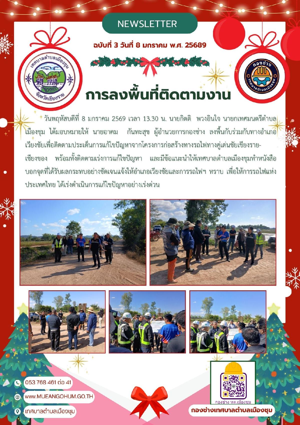 วันพฤหัสบดีที่ 8 มกราคม 2569 เวลา 13.30 น. นายกิตติ พวงอินใจ นายกเทศมนตรีตำบลเมืองชุม ได้มอบหมายให้ นายอาคม กันทะสุข ผู้อำนวยการกองช่าง ลงพื้นกับร่วมกับทางอำเภอเวียงชัยเพื่อติดตามประเด็นการแก้ไขปัญหาจากโครงการก่อสร้างทางรถไฟทางคู่เด่นชัยเชียงราย-เชียงของ พร้อมทั้งติดตามเร่งการแก้ไขปัญหา และมีข้อแนะนำให้เทศบาลตำบลเมืองชุมทำหนังสือบอกจุดที่ได้รับผลกระทบอย่างชัดเจนแจ้งให้อำเภอเวียงชัยและการรถไฟฯ ทราบ เพื่อให้การรถไฟแห่งประเทศไทย ได้เร่งดำเนินการแก้ไขปัญหาอย่างเร่งด่วน