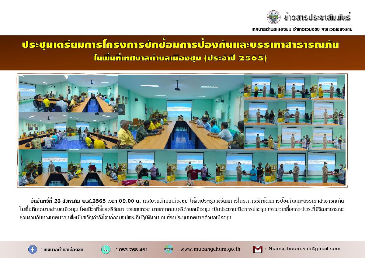 วันจันทร์ที่ 22 สิงหาคม พ.ศ.2565 เวลา 09.00 น. เทศบาลตำบลเมืองชุม ได้จัดประชุมเตรียมการโครงการซักซ้อมการป้องกันและบรรเทาสาธารณภัย ในพื้นที่เทศบาลตำบลเมืองชุม โดยมีว่าที่ร้อยตรีชัยยา พลอยแหวน นายกเทศมนตรีตำบลเมืองชุม เป็นประธานเปิดการประชุม และมอบเสื้อแก่ อปพร.ที่มีจิตสาธารณะร่วมงานกับทางเทศบาล เพื่อเป็นขวัญกำลังใจแก่กลุ่มอปพร.ที่ปฏิบัติงาน ณ ห้องประชุมเทศบาลตำบลเมืองชุม