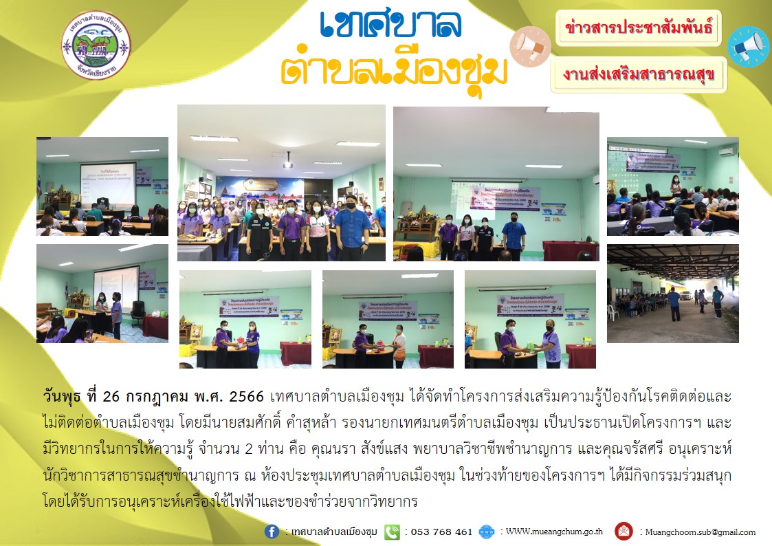 วันพุธ ที่ 26 กรกฎาคม พ.ศ.2566 เทศบาลตำบลเมืองชุม ได้จัดทำโครงการส่งเสริมความรู้ป้องกันโรคติดต่อและไม่ติดต่อตำบลเมืองชุม โดยมีนายสมศักดิ์ คำสุหล้า รองนายกเทศมนตรีตำบลเมืองชุม เป็นประธานเปิดโครงการฯ และมีวิทยากรในการให้ความรู้ จำนวน 2 ท่าน คือ คุณนรา สังข์แสง พยาบาลวิชาชีพชำนาญการ และคุณจรัสศรี อนุเคราะห์ นักวิชาการสาธารณสุขชำนาญการ ณ ห้องประชุมเทศบาลตำบลเมืองชุม ในช่วงท้ายของโครงการฯ ได้มีกิจกรรมร่วมสนุกโดยได้รับการอนุเคราะห์เครื่องใช้ไฟฟ้าและของชำร่วยจากวิทยากร