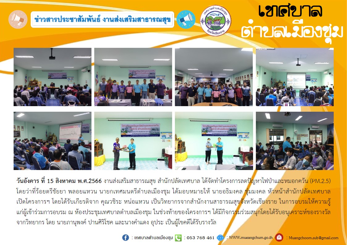 วันอังคาร ที่ 15 สิงหาคม พ.ศ.2566 งานส่งเสริมสาธารณสุข สำนักปลัดเทศบาล ได้จัดทำโครงการลดปัญหาไฟป่าและหมอกควัน (PM. 2.5) โดยว่าที่ร้อยตรีชัยยา พลอยแหวน นายกเทศมนตรีตำบลเมืองชุม ได้มอบหมายให้ นายอธิมงคล ชุ่มมงคล หัวหน้าสำนักปลัดเทศบาล เปิดโครงการฯ โดยได้รับเกียรติจาก คุณวชิระ หน่อแหวน เป็นวิทยากรจากสำนักงานสาธารณสุขจังหวัดเชียงราย ในการอบรมให้ความรู้แก่ผู้เข้าร่วมการอบรม ณ ห้องประชุมเทศบาลตำบลเมืองชุม ในช่วงท้ายของโครงการฯ ได้มีกิจกรรมร่วมสนุกโดยได้รับอนุเคราะห์ของรางวัลจากวิทยากร โดย นายภานุพงค์ ปานศิริโชค และนางคำแดง อุประ เป็นผู้โขคดีได้รับรางวัล