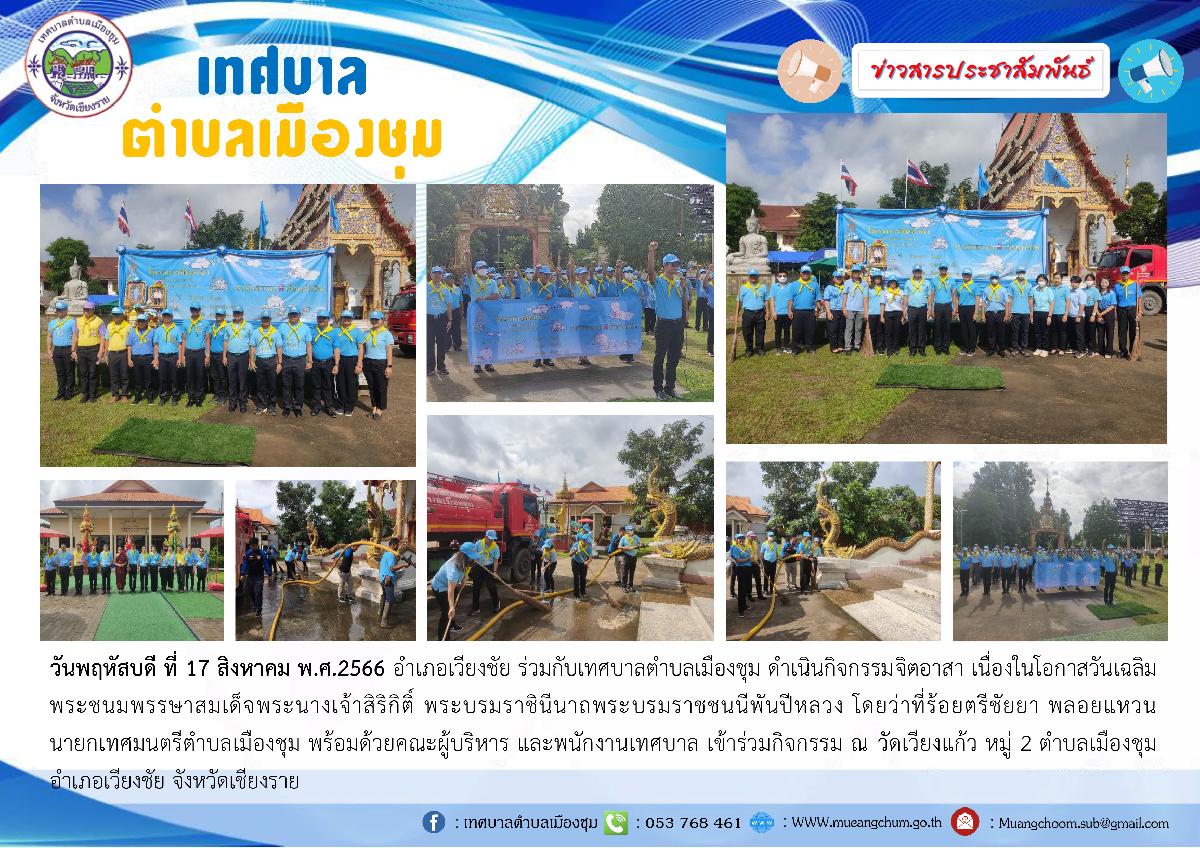 วันพฤหัสบดี ที่ 17 สิงหาคม พ.ศ.2566 อำเภอเวียงชัย ร่วมกับเทศบาลตำบลเมืองชุม ดำเนินกิจกรรมจิตอาสา เนื่องในโอกาสวันเฉลิมพระชนมพรรษาสมเด็จพระนางเจ้าสิริกิติ์ พระบรมราชินีนาถพระบรมราชชนนีพันปีหลวง โดยว่าที่ร้อยตรีชัยยา พลอยแหวน นายกเทศมนตรีตำบลเมืองชุม พร้อมด้วยคณะผู้บริหาร และพนักงานเทศบาล เข้าร่วมกิจกรรม ณ วัดเวียงแก้ว หมู่ 2 ตำบลเมืองชุม อำเภอเวียงชัย จังหวัดเชียงราย
