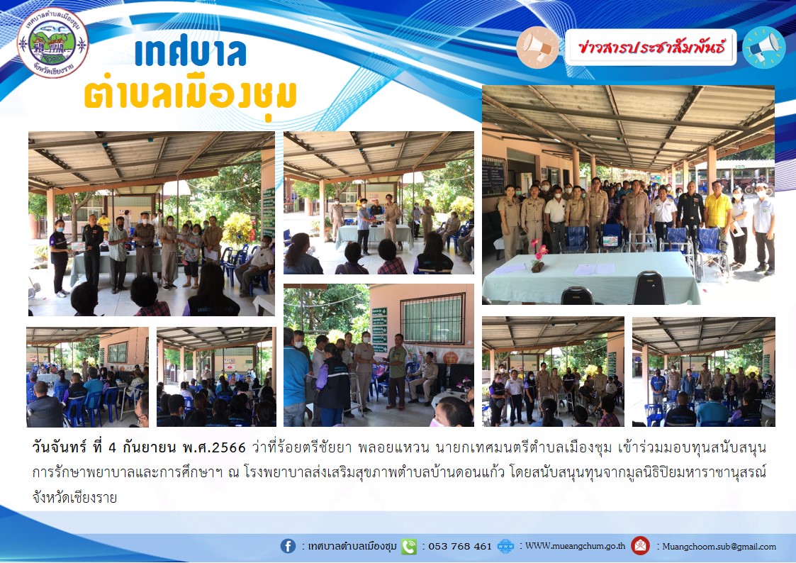 วันจันทร์ ที่ 4 กันยายน พ.ศ.2566 ว่าที่ร้อยตรีชัยยา พลอยแหวน นายกเทศมนตรีตำบลเมืองชุม เข้าร่วมมอบทุนสนับสนุนการรักษาพยาบาลและการศึกษาฯ ณ โรงพยาบาลส่งเสริมสุขภาพตำบลบ้านดอนแก้ว โดยสนับสนุนทุนจากมูลนิธิปิยมหาราชานุสรณ์ จังหวัดเชียงราย
