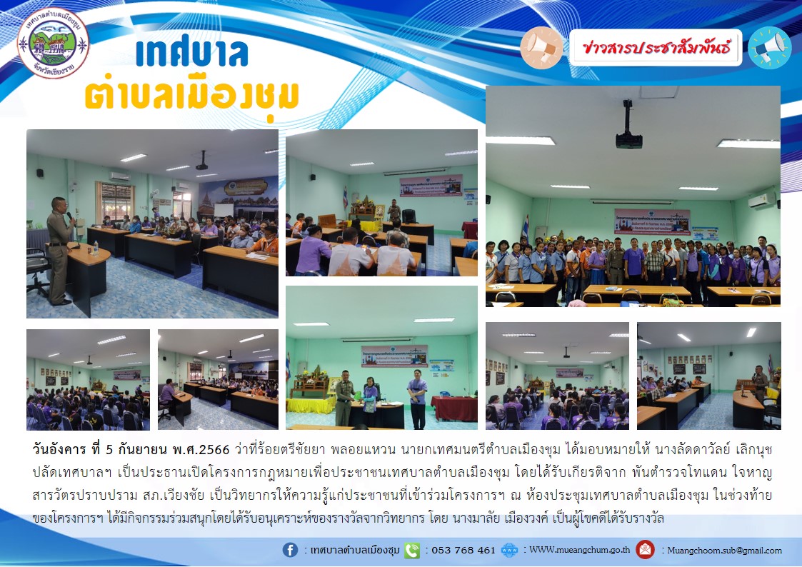 วันอังคาร ที่ 5 กันยายน พ.ศ.2566 ว่าที่ร้อยตรีชัยยา พลอยแหวน นายกเทศมนตรีตำบลเมืองชุม ได้มอบหมายให้ นางลัดดาวัลย์ เลิกนุช ปลัดเทศบาลฯ เป็นประธานเปิดโครงการกฎหมายเพื่อประชาชนเทศบาลตำบลเมืองชุม โดยได้รับเกียรติจาก พันตำรวจโทแดน ใจหาญ สารวัตรปราบปราม สภ.เวียงชัย เป็นวิทยากรให้ความรู้แก่ประชาชนที่เข้าร่วมโครงการฯ ณ ห้องประชุมเทศบาลตำบลเมืองชุม ในช่วงท้ายของโครงการฯ ได้มีกิจกรรมร่วมสนุกโดยได้รับอนุเคราะห์ของรางวัลจากวิทยากร โดย นางมาลัย เมืองวงค์ เป็นผู้โขคดีได้รับรางวัล