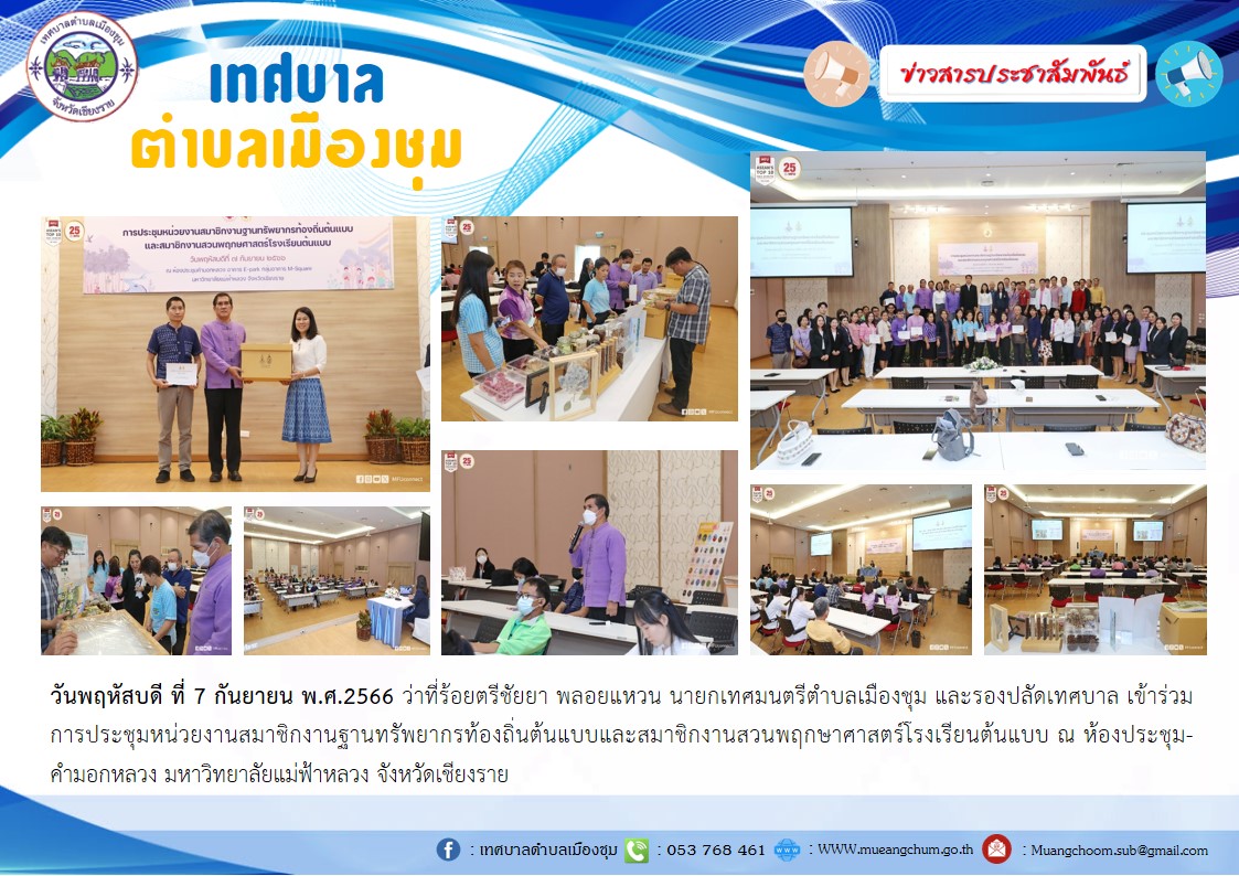 วันพฤหัสบดี ที่ 7 กันยายน พ.ศ.2566 ว่าที่ร้อยตรีชัยยา พลอยแหวน นายกเทศมนตรีตำบลเมืองชุม และรองปลัดเทศบาล เข้าร่วมการประชุมหน่วยงานสมาชิกงานฐานทรัพยากรท้องถิ่นต้นแบบและสมาชิกงานสวนพฤกษาศาสตร์โรงเรียนต้นแบบ ณ ห้องประชุมคำมอกหลวง มหาวิทยาลัยแม่ฟ้าหลวง จังหวัดเชียงราย