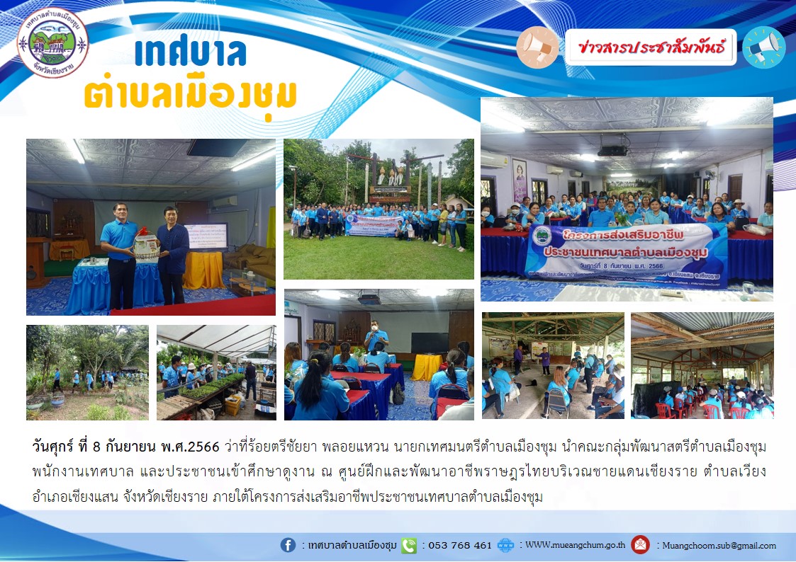 วันศุกร์ ที่ 8 กันยายน พ.ศ.2566 ว่าที่ร้อยตรีชัยยา พลอยแหวน นายกเทศมนตรีตำบลเมืองชุม นำคณะกลุ่มพัฒนาสตรีตำบลเมืองชุม พนักงานเทศบาล และประชาชนเข้าศึกษาดูงาน ณ ศูนย์ฝึกและพัฒนาอาชีพราษฎรไทยบริเวณชายแดนเชียงราย ตำบลเวียง อำเภอเชียงแสน จังหวัดเชียงราย ภายใต้โครงการส่งเสริมอาชีพประชาชนเทศบาลตำบลเมืองชุม