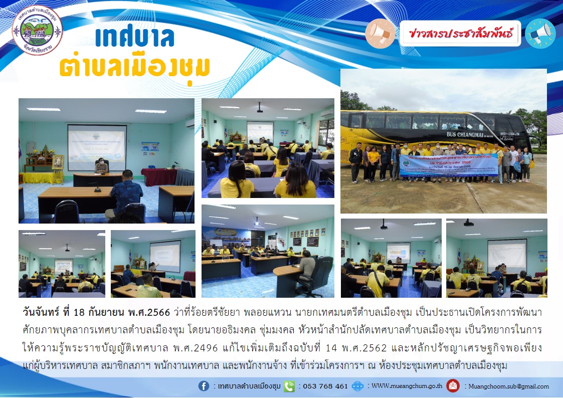 วันจันทร์ ที่ 18 กันยายน พ.ศ.2566 ว่าที่ร้อยตรีชัยยา พลอยแหวน นายกเทศมนตรีตำบลเมืองชุม เป็นประธานเปิดโครงการพัฒนาศักยภาพบุคลากรเทศบาลตำบลเมืองชุม โดยนายอธิมงคล ชุ่มมงคล หัวหน้าสำนักปลัดเทศบาลตำบลเมืองชุม เป็นวิทยากรในการให้ความรู้พระราชบัญญัติเทศบาล พ.ศ.2496 แก้ไขเพิ่มเติมถึงฉบับที่ 14 พ.ศ.2562 และหลักปรัชญาเศรษฐกิจพอเพียง แก่ผู้บริหารเทศบาล สมาชิกสภาฯ พนักงานเทศบาล และพนักงานจ้าง ที่เข้าร่วมโครงการฯ ณ ห้องประชุมเทศบาลตำบลเมืองชุม