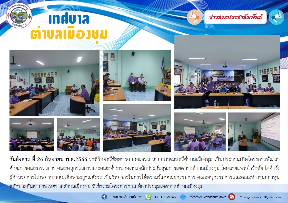 วันอังคาร ที่ 26 กันยายน พ.ศ.2566 ว่าที่ร้อยตรีชัยยา พลอยแหวน นายกเทศมนตรีตำบลเมืองชุม เป็นประธานเปิดโครงการพัฒนาศักยภาพคณะกรรมการ คณะอนุกรรมการและคณะทำงานกองทุนหลักประกันสุขภาพเทศบาลตำบลเมืองชุม โดยนายแพทย์ธวัชชัย ใจคำวัง ผู้อำนวยการโรงพยาบาลสมเด็จพระญาณสังวร เป็นวิทยากรในการให้ความรู้แก่คณะกรรมการ คณะอนุกรรมการและคณะทำงานกองทุนหลักประกันสุขภาพเทศบาลตำบลเมืองชุม ที่เข้าร่วมโครงการฯ ณ ห้องประชุมเทศบาลตำบลเมืองชุม