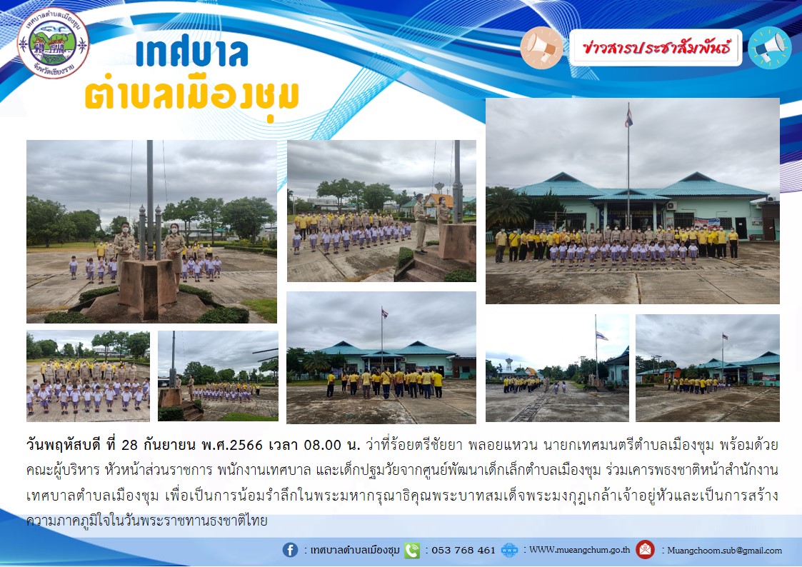 วันพฤหัสบดี ที่ 28 กันยายน พ.ศ.2566 เวลา 08.00 น. ว่าที่ร้อยตรีชัยยา พลอยแหวน นายกเทศมนตรีตำบลเมืองชุม พร้อมด้วยคณะผู้บริหาร หัวหน้าส่วนราชการ พนักงานเทศบาล และเด็กปฐมวัยจากศูนย์พัฒนาเด็กเล็กตำบลเมืองชุม ร่วมเคารพธงชาติหน้าสำนักงานเทศบาลตำบลเมืองชุม เพื่อเป็นการน้อมรำลึกในพระมหากรุณาธิคุณพระบาทสมเด็จพระมงกุฎเกล้าเจ้าอยู่หัวและเป็นการสร้างความภาคภูมิใจในวันพระราชทานธงชาติไทย