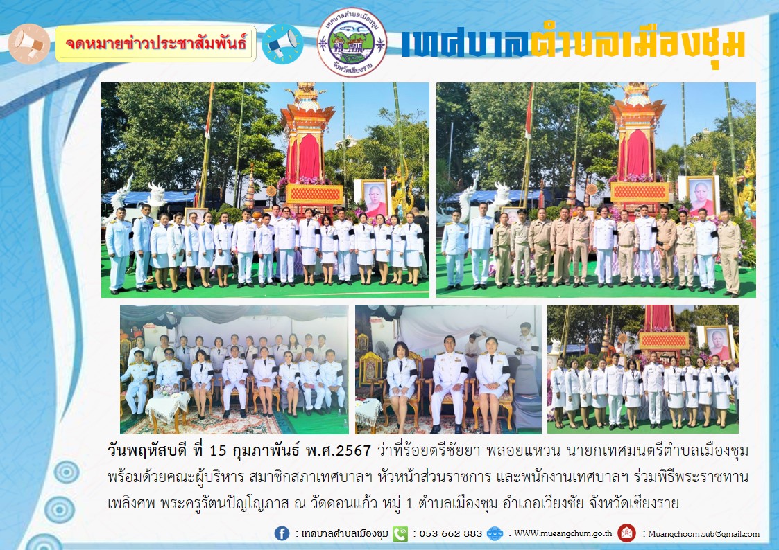 วันพฤหัสบดี ที่ 15 กุมภาพันธ์ พ.ศ.2567 ว่าที่ร้อยตรีชัยยา พลอยแหวน นายกเทศมนตรีตำบลเมืองชุม พร้อมด้วยคณะผู้บริหาร สมาชิกสภาเทศบาลฯ หัวหน้าส่วนราชการ และพนักงานเทศบาลฯ ร่วมพิธีพระราชทานเพลิงศพ พระครูรัตนปัญโญภาส ณ วัดดอนแก้ว หมู่ 1 ตำบลเมืองชุม อำเภอเวียงชัย จังหวัดเชียงราย