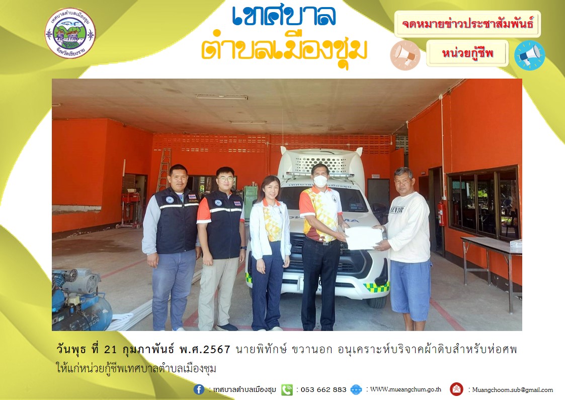 วันพุธ ที่ 21 กุมภาพันธ์ พ.ศ.2567 นายพิทักษ์ ขวานอก อนุเคราะห์บริจาคผ้าดิบสำหรับห่อศพ ให้แก่หน่วยกู้ชีพเทศบาลตำบลเมืองชุม