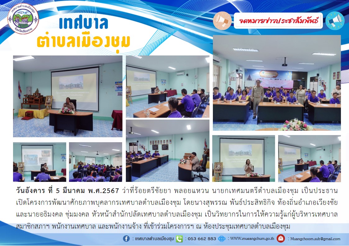 วันอังคาร ที่ 5 มีนาคม พ.ศ.2567 ว่าที่ร้อยตรีชัยยา พลอยแหวน นายกเทศมนตรีตำบลเมืองชุม เป็นประธานเปิดโครงการพัฒนาศักยภาพบุคลากรเทศบาลตำบลเมืองชุม โดยนางสุพรรณ พันธ์ประสิทธิกิจ ท้องถิ่นอำเภอเวียงชัย และนายอธิมงคล ชุ่มมงคล หัวหน้าสำนักปลัดเทศบาลตำบลเมืองชุม เป็นวิทยากรในการให้ความรู้แก่ผู้บริหารเทศบาล สมาชิกสภาฯ พนักงานเทศบาล และพนักงานจ้าง ที่เข้าร่วมโครงการฯ ณ ห้องประชุมเทศบาลตำบลเมืองชุม