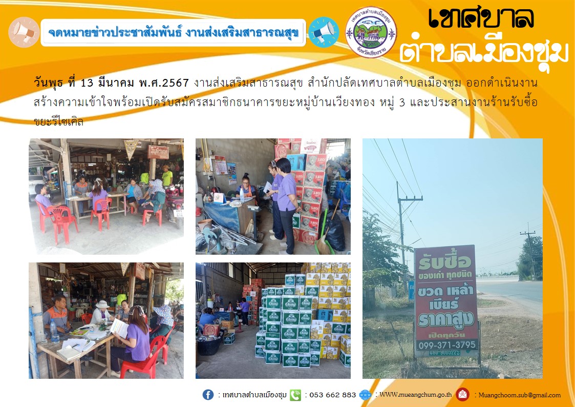 วันพุธ ที่ 13 มีนาคม พ.ศ.2567 งานส่งเสริมสาธารณสุข สำนักปลัดเทศบาลตำบลเมืองชุม ออกดำเนินงานสร้างความเข้าใจพร้อมเปิดรับสมัครสมาชิกธนาคารขยะหมู่บ้านเวียงทอง หมู่ 3 และประสานงานร้านรับซื้อขยะรีไซเคิล