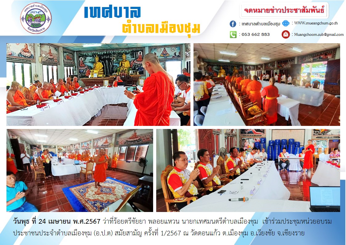 วันพุธ ที่ 24 เมษายน พ.ศ.2567 ว่าที่ร้อยตรีชัยยา พลอยแหวน นายกเทศมนตรีตำบลเมืองชุม เข้าร่วมประชุมหน่วยอบรมประชาชนประจำตำบลเมืองชุม (อ.ป.ต) สมัยสามัญ ครั้งที่ 1/2567 ณ วัดดอนแก้ว ต.เมืองชุม อ.เวียงชัย จ.เชียงราย