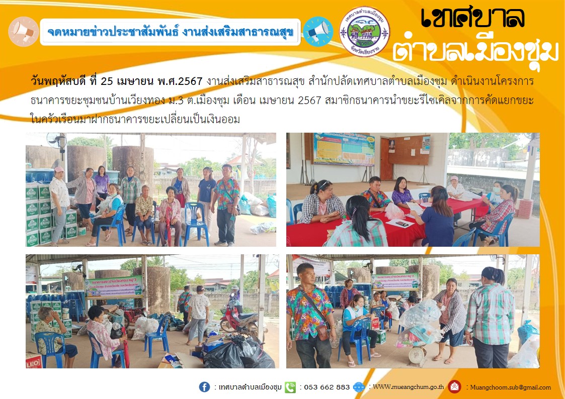 วันพฤหัสบดี ที่ 25 เมษายน พ.ศ.2567 งานส่งเสริมสาธารณสุข สำนักปลัดเทศบาลตำบลเมืองชุม ดำเนินงานโครงการธนาคารขยะชุมชนบ้านเวียงทอง ม.3 ต.เมืองชุม เดือน เมษายน 2567 สมาชิกธนาคารนำขยะรีไซเคิลจากการคัดแยกขยะในครัวเรือนมาฝากธนาคารขยะเปลี่ยนเป็นเงินออม