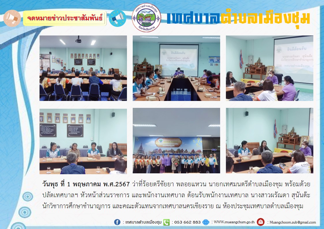 วันพุธ ที่ 1 พฤษภาคม พ.ศ.2567 ว่าที่ร้อยตรีชัยยา พลอยแหวน นายกเทศมนตรีตำบลเมืองชุม พร้อมด้วยปลัดเทศบาลฯ หัวหน้าส่วนราชการ และพนักงานเทศบาล ต้อนรับพนักงานเทศบาล นางสาวผรัณดา สุนันต๊ะ นักวิชาการศึกษาชำนาญการ และคณะตัวแทนจากเทศบาลนครเชียงราย ณ ห้องประชุมเทศบาลตำบลเมืองชุม