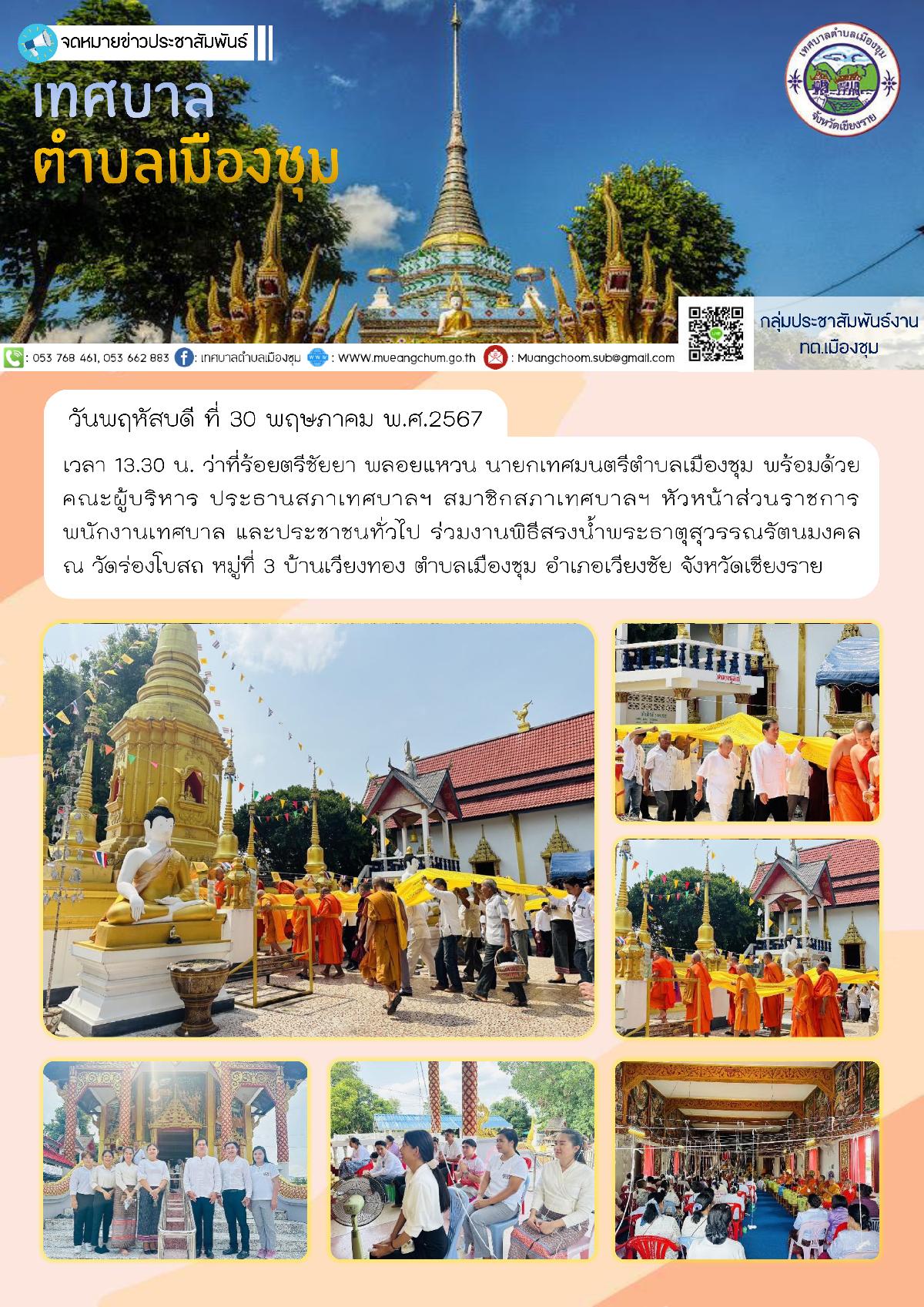 วันพฤหัสบดี ที่ 30 พฤษภาคม พ.ศ.2567 เวลา 13.30 น. ว่าที่ร้อยตรีชัยยา พลอยแหวน นายกเทศมนตรีตำบลเมืองชุม พร้อมด้วยคณะผู้บริหาร ประธานสภาเทศบาลฯ สมาชิกสภาเทศบาลฯ หัวหน้าส่วนราชการ พนักงานเทศบาล และประชาชนทั่วไป ร่วมงานพิธีสรงน้ำพระธาตุสุวรรณรัตนมงคล ณ วัดร่องโบสถ หมู่ที่ 3 บ้านเวียงทอง ตำบลเมืองชุม อำเภอเวียงชัย จังหวัดเชียงราย