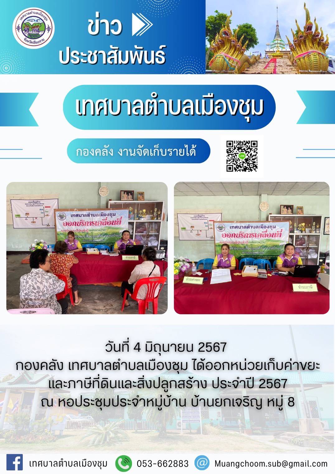 งานจัดเก็บและพัฒนารายได้ กองคลังเทศบาลตำบลเมืองชุม ได้ออกหน่วยบริการนอกสถานที่ ค่าธรรเนียมจัดเก็บขยะมูลฝอย ประจำปีงบประมาณ 2569 ณ หอประชุมหมู่ที่2 บ้านเวียงแก้ว