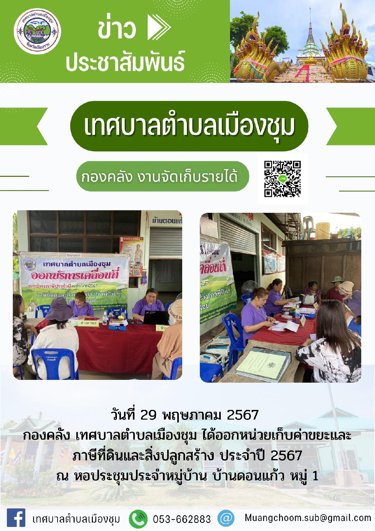 งานจัดเก็บและพัฒนารายได้ กองคลังเทศบาลตำบลเมืองชุม ได้ออกหน่วยบริการนอกสถานที่ ค่าธรรเนียมจัดเก็บขยะมูลฝอย ประจำปีงบประมาณ 2569 ณ หอประชุมหมู่ที่2 บ้านเวียงแก้ว