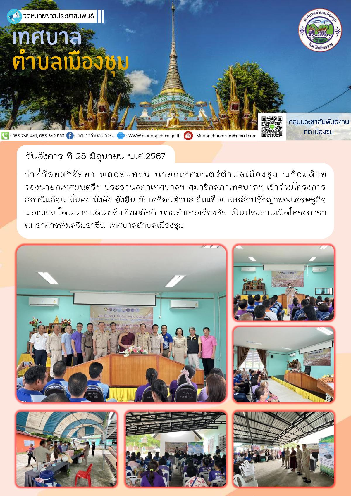 วันอังคาร ที่ 25 มิถุนายน พ.ศ.2567 ว่าที่ร้อยตรีชัยยา พลอยแหวน นายกเทศมนตรีตำบลเมืองชุม พร้อมด้วยรองนายกเทศมนตรีฯ ประธานสภาเทศบาลฯ สมาชิกสภาเทศบาลฯ เข้าร่วมโครงการสถานีแก้จน มั่นคง มั่งคั่ง ยั่งยืน ขับเคลื่อนตำบลเข็มแข็งตามหลักปรัชญาของเศรษฐกิจพอเพียง โดนนายบดินทร์ เทียมภักดี นายอำเภอเวียงชัย เป็นประธานเปิดโครงการฯ ณ อาคารส่งเสริมอาชีพ เทศบาลตำบลเมืองชุม
