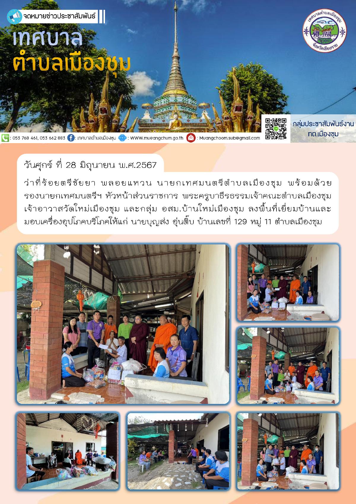 วันศุกร์ ที่ 28 มิถุนายน พ.ศ.2567 ว่าที่ร้อยตรีชัยยา พลอยแหวน นายกเทศมนตรีตำบลเมืองชุม พร้อมด้วยรองนายกเทศมนตรีฯ หัวหน้าส่วนราชการ พระครูบาธีรธรรมเจ้าคณะตำบลเมืองชุม เจ้าอาวาสวัดใหม่เมืองชุม และกลุ่ม อสม.บ้านใหม่เมืองชุม ลงพื้นที่เยี่ยมบ้านและมอบเครื่องอุปโภคบริโภคให้แก่ นายบุญส่ง อุ่นติ๊บ บ้านเลขที่ 129 หมู่ 11 ตำบลเมืองชุม