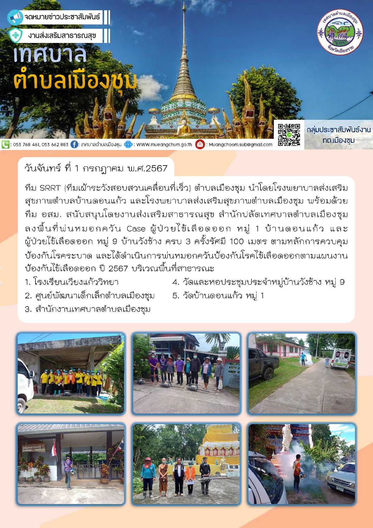 วันจันทร์ ที่ 1 กรกฎาคม พ.ศ.2567 ทีม SRRT (ทีมเฝ้าระวังสอบสวนเคลื่อนที่เร็ว) ตำบลเมืองชุม นำโดยโรงพยาบาลส่งเสริมสุขภาพตำบลบ้านดอนแก้ว และโรงพยาบาลส่งเสริมสุขภาพตำบลเมืองชุม พร้อมด้วยทีม อสม. สนับสนุนโดยงานส่งเสริมสาธารณสุข สำนักปลัดเทศบาลตำบลเมืองชุม ลงพื้นที่พ่นหมอกควัน Case ผู้ป่วยไข้เลือดออก หมู่ 1 บ้านดอนแก้ว และผู้ป่วยไข้เลือดออก หมู่ 9 บ้านวังช้าง ครบ 3 ครั้งรัศมี 100 เมตร ตามหลักการควบคุมป้องกันโรคระบาด และได้ดำเนินการพ่นหมอกควันป้องกันโรคไข้เลือดออกตามแผนงานป้องกันไข้เลือดออก ปี 2567 บริเวณพื้นที่สาธารณะ