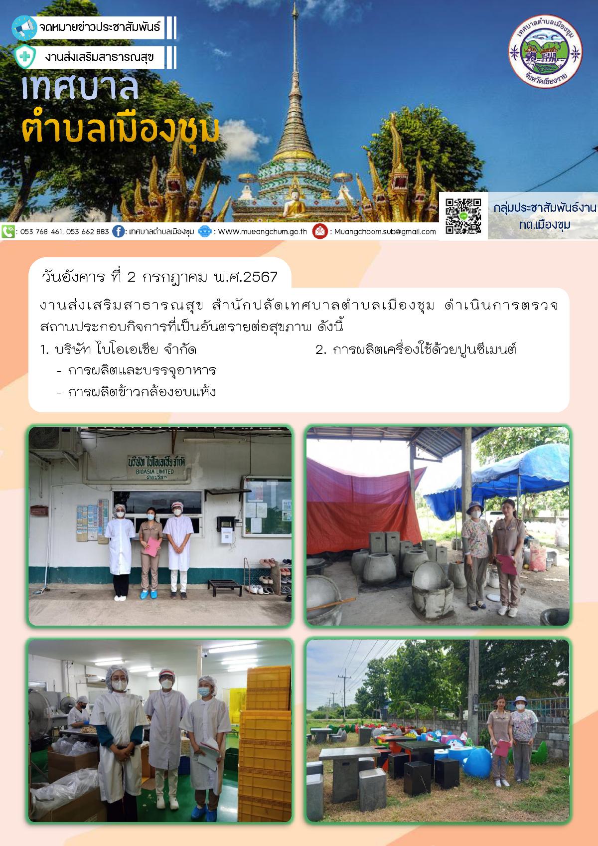 วันอังคาร ที่ 2 กรกฎาคม พ.ศ.2567 งานส่งเสริมสาธารณสุข สำนักปลัดเทศบาลตำบลเมืองชุม ดำเนินการตรวจสถานประกอบกิจการที่เป็นอันตรายต่อสุขภาพ ดังนี้