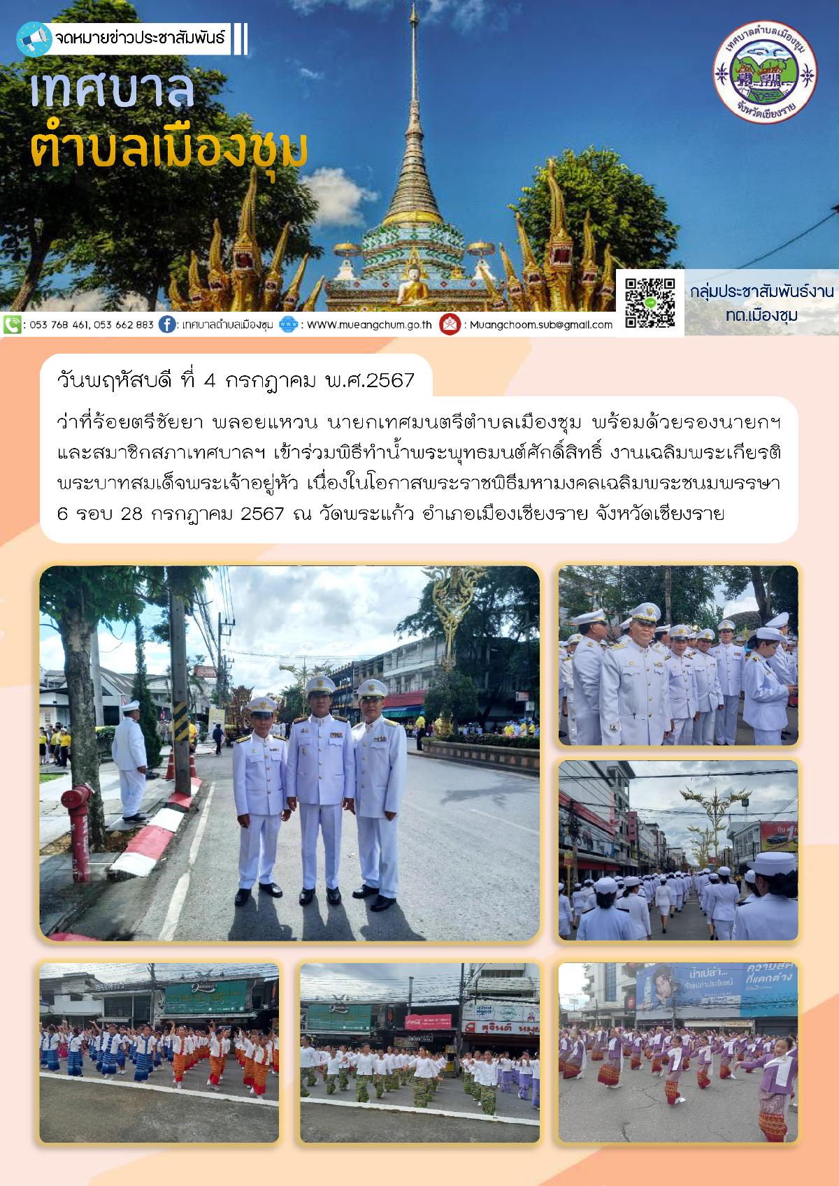 วันพฤหัสบดี ที่ 4 กรกฎาคม พ.ศ.2567 ว่าที่ร้อยตรีชัยยา พลอยแหวน นายกเทศมนตรีตำบลเมืองชุม พร้อมด้วยรองนายกฯ และสมาชิกสภาเทศบาลฯ เข้าร่วมพิธีทำน้ำพระพุทธมนต์ศักดิ์สิทธิ์ งานเฉลิมพระเกียรติพระบาทสมเด็จพระเจ้าอยู่หัว เนื่องในโอกาสพระราชพิธีมหามงคลเฉลิมพระชนมพรรษา 6 รอบ 28 กรกฎาคม 2567 ณ วัดพระแก้ว อำเภอเมืองเชียงราย จังหวัดเชียงราย