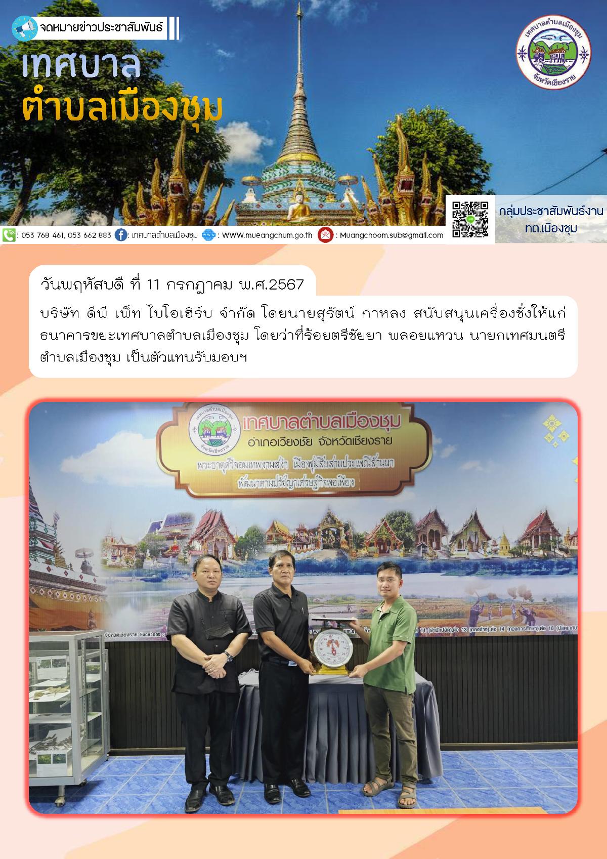 วันพฤหัสบดี ที่ 11 กรกฎาคม พ.ศ.2567 บริษัท ดีพี เพ็ท ไบโอเฮิร์บ จำกัด โดยนายสุรัตน์ กาหลง สนับสนุนเครื่องชั่งให้แก่ธนาคารขยะเทศบาลตำบลเมืองชุม โดยว่าที่ร้อยตรีชัยยา พลอยแหวน นายกเทศมนตรีตำบลเมืองชุม เป็นตัวแทนรับมอบฯ