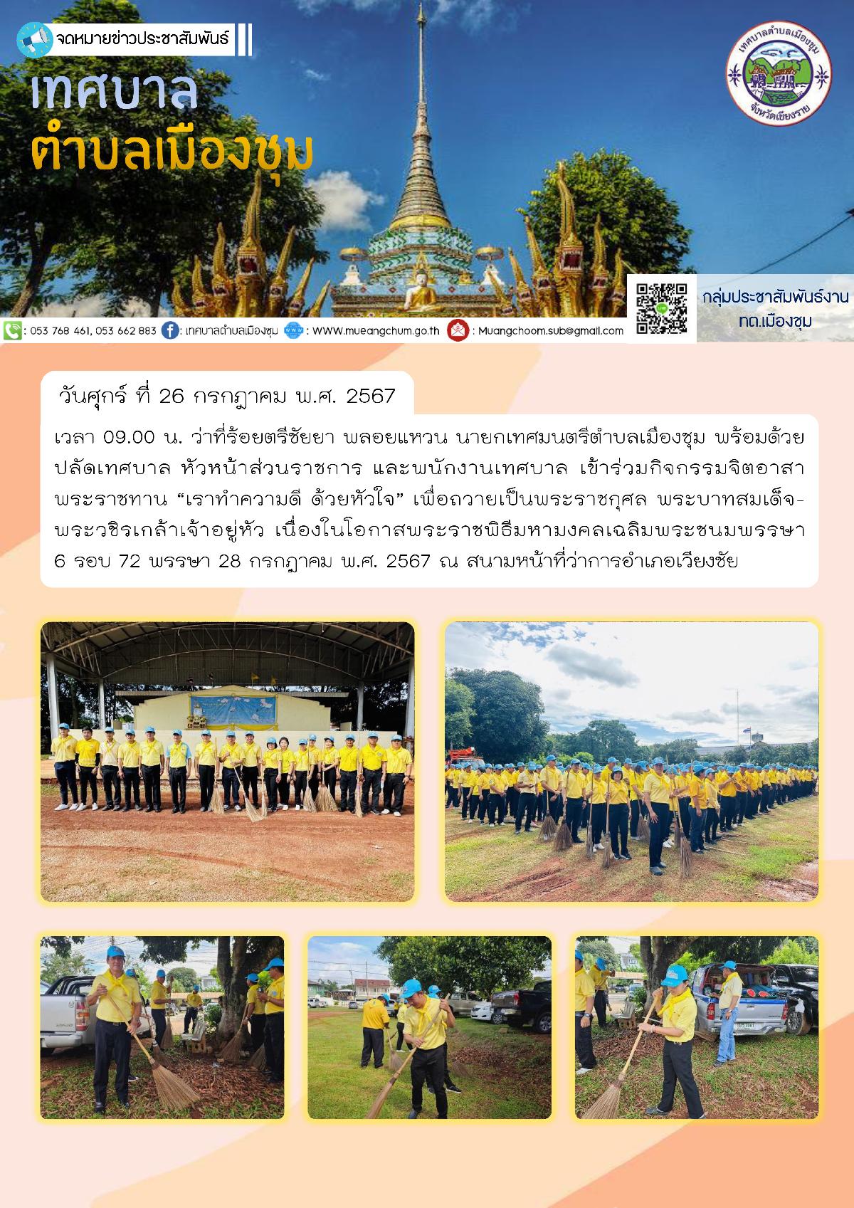 วันศุกร์ ที่ 26 กรกฎาคม พ.ศ. 2567 เวลา 09.00 น. ว่าที่ร้อยตรีชัยยา พลอยแหวน นายกเทศมนตรีตำบลเมืองชุม พร้อมด้วยปลัดเทศบาล หัวหน้าส่วนราชการ และพนักงานเทศบาล เข้าร่วมกิจกรรมจิตอาสาพระราชทาน “เราทำความดี ด้วยหัวใจ” เพื่อถวายเป็นพระราชกุศล พระบาทสมเด็จพระวชิรเกล้าเจ้าอยู่หัว เนื่องในโอกาสพระราชพิธีมหามงคลเฉลิมพระชนมพรรษา 6 รอบ 72 พรรษา 28 กรกฎาคม พ.ศ. 2567 ณ สนามหน้าที่ว่าการอำเภอเวียงชัย