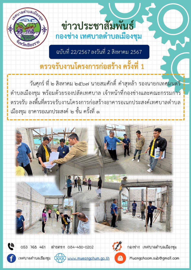 วันศุกร์ ที่ 2 สิงหาคม 2567 นายสมศักดิ์ คำสุหล้า รองนายกเทศมนตรีตำบลเมืองชุม พร้อมด้วยรองปลัดเทศบาล เจ้าหน้าที่กองช่างและคณะกรรมการ ตรวจรับ ลงพื้นที่ตรวจรับงานโครงการก่อสร้างอาคารอเนกประสงค์เทศบาลตำบลเมืองชุม อาคารอเนกประสงค์ 2 ชั้น ครั้งที่
