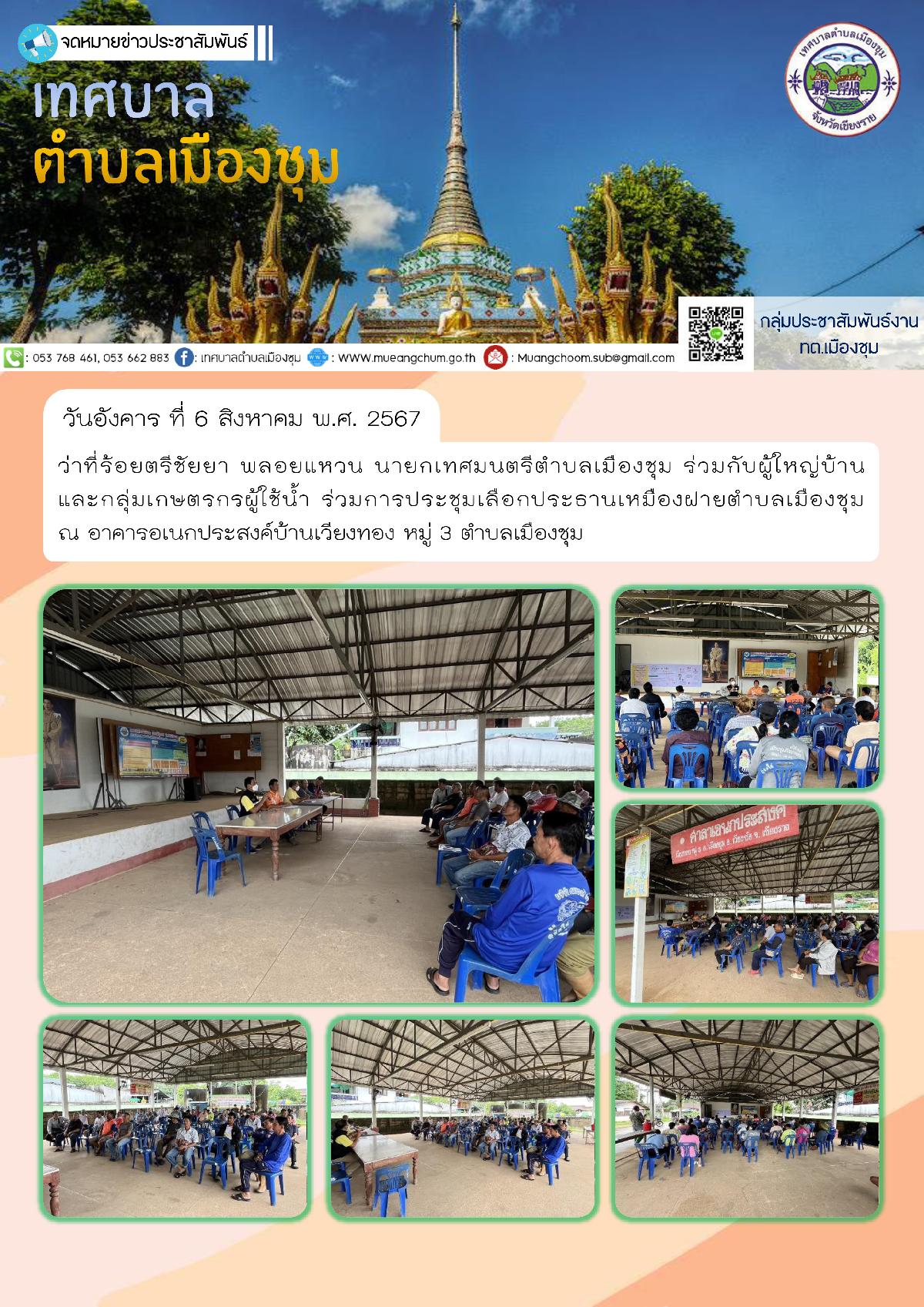 วันอังคาร ที่ 6 สิงหาคม พ.ศ. 2567 ว่าที่ร้อยตรีชัยยา พลอยแหวน นายกเทศมนตรีตำบลเมืองชุม ร่วมกับผู้ใหญ่บ้าน และกลุ่มเกษตรกรผู้ใช้น้ำ ร่วมการประชุมเลือกประธานเหมืองฝายตำบลเมืองชุม ณ อาคารอเนกประสงค์บ้านเวียงทอง หมู่ 3 ตำบลเมืองชุม
