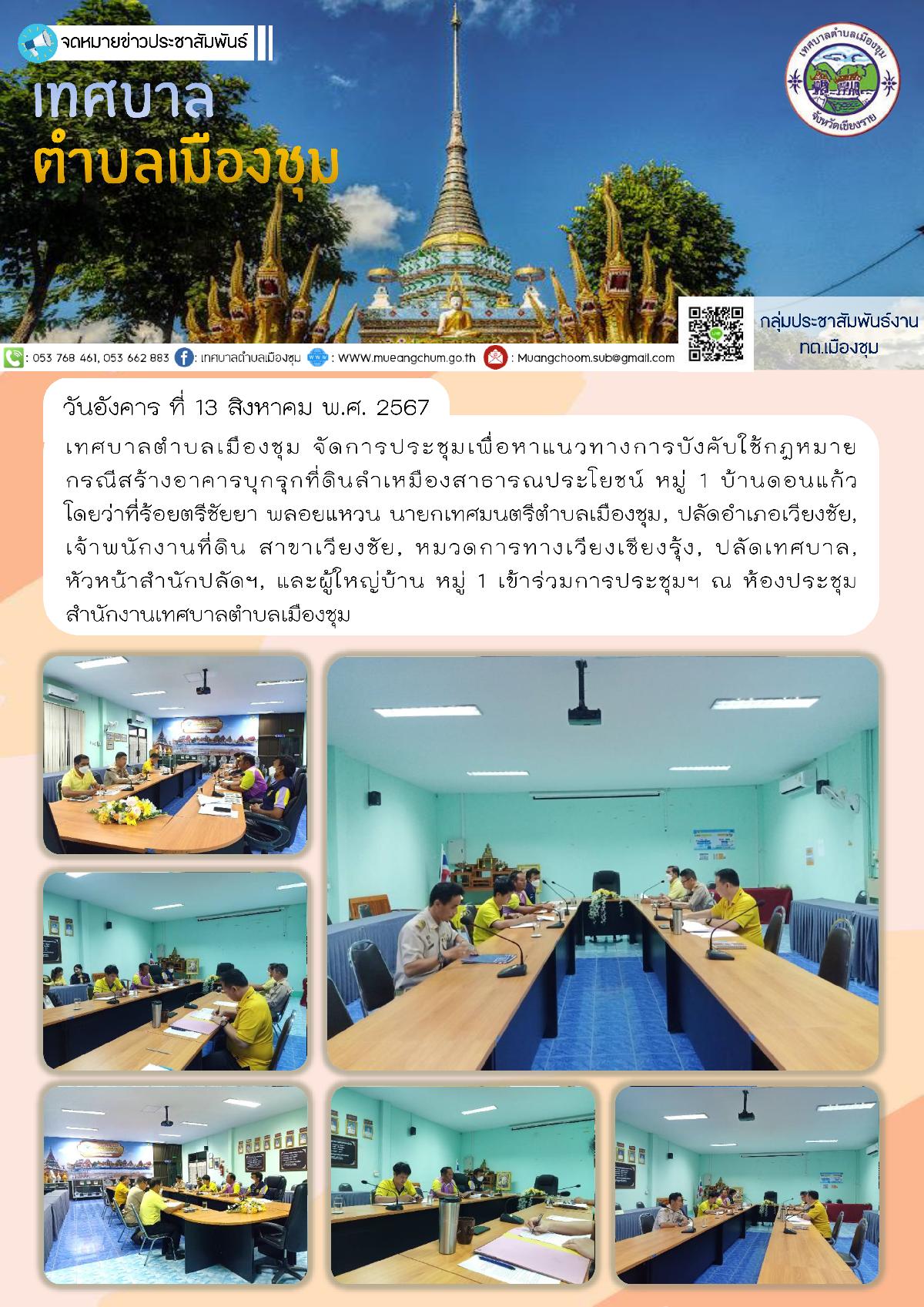 วันอังคาร ที่ 13 สิงหาคม พ.ศ. 2567 เทศบาลตำบลเมืองชุม จัดการประชุมเพื่อหาแนวทางการบังคับใช้กฎหมาย กรณีสร้างอาคารบุกรุกที่ดินลำเหมืองสาธารณประโยชน์ หมู่ 1 บ้านดอนแก้ว โดยว่าที่ร้อยตรีชัยยา พลอยแหวน นายกเทศมนตรีตำบลเมืองชุม, ปลัดอำเภอเวียงชัย, เจ้าพนักงานที่ดิน สาขาเวียงชัย, หมวดการทางเวียงเชียงรุ้ง, ปลัดเทศบาล, หัวหน้าสำนักปลัดฯ, และผู้ใหญ่บ้าน หมู่ 1 เข้าร่วมการประชุมฯ ณ ห้องประชุมสำนักงานเทศบาลตำบลเมืองชุม
