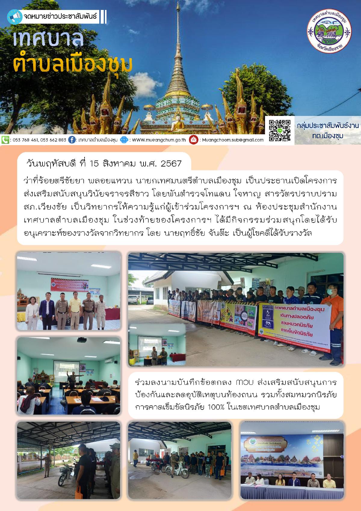 วันพฤหัสบดี ที่ 15 สิงหาคม พ.ศ. 2567 ว่าที่ร้อยตรีชัยยา พลอยแหวน นายกเทศมนตรีตำบลเมืองชุม เป็นประธานเปิดโครงการส่งเสริมสนับสนุนวินัยจราจรสีขาว โดยพันตำรวจโทแดน ใจหาญ สารวัตรปราบปราม สภ.เวียงชัย เป็นวิทยากรให้ความรู้แก่ผู้เข้าร่วมโครงการฯ ณ ห้องประชุมสำนักงานเทศบาลตำบลเมืองชุม ในช่วงท้ายของโครงการฯ ได้มีกิจกรรมร่วมสนุกโดยได้รับอนุเคราะห์ของรางวัลจากวิทยากร โดย นายฤทธิ์ชัย จันต๊ะ เป็นผู้โขคดีได้รับรางวัล