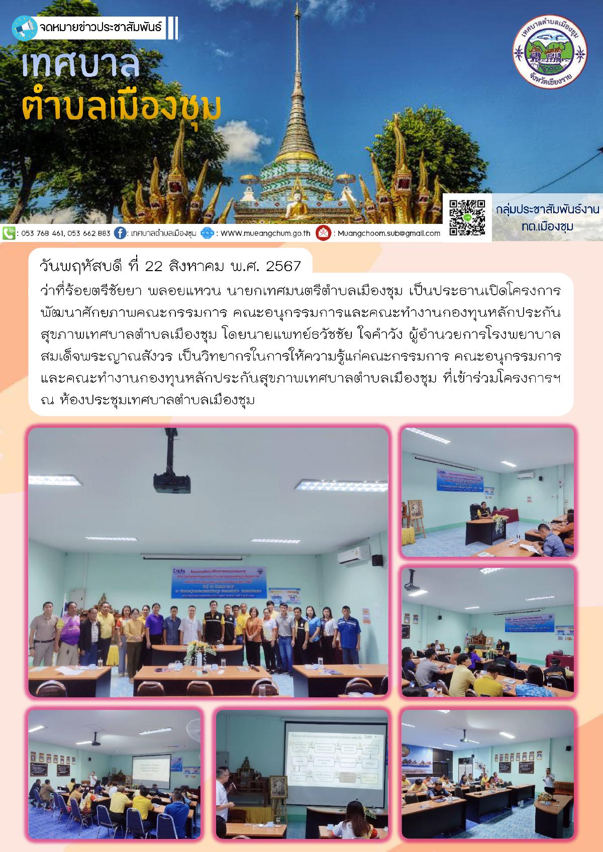 วันพฤหัสบดี ที่ 22 สิงหาคม พ.ศ. 2567 ว่าที่ร้อยตรีชัยยา พลอยแหวน นายกเทศมนตรีตำบลเมืองชุม เป็นประธานเปิดโครงการพัฒนาศักยภาพคณะกรรมการ คณะอนุกรรมการและคณะทำงานกองทุนหลักประกันสุขภาพเทศบาลตำบลเมืองชุม โดยนายแพทย์ธวัชชัย ใจคำวัง ผู้อำนวยการโรงพยาบาลสมเด็จพระญาณสังวร เป็นวิทยากรในการให้ความรู้แก่คณะกรรมการ คณะอนุกรรมการและคณะทำงานกองทุนหลักประกันสุขภาพเทศบาลตำบลเมืองชุม ที่เข้าร่วมโครงการฯ ณ ห้องประชุมเทศบาลตำบลเมืองชุม