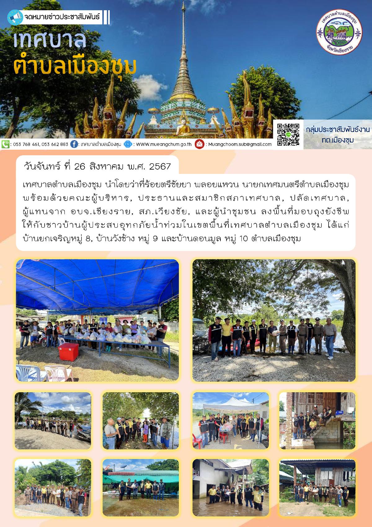 วันจันทร์ ที่ 26 สิงหาคม พ.ศ. 2567 เทศบาลตำบลเมืองชุม นำโดยว่าที่ร้อยตรีชัยยา พลอยแหวน นายกเทศมนตรีตำบลเมืองชุม พร้อมด้วยคณะผู้บริหาร, ประธานและสมาชิกสภาเทศบาล, ปลัดเทศบาล, ผู้แทนจาก อบจ.เชียงราย, สภ.เวียงชัย, และผู้นำชุมชน ลงพื้นที่มอบถุงยังชีพให้กับชาวบ้านผู้ประสบอุทกภัยน้ำท่วมในเขตพื้นที่เทศบาลตำบลเมืองชุม ได้แก่ บ้านยกเจริญหมู่ 8, บ้านวังช้าง หมู่ 9 และบ้านดอนมูล หมู่ 10 ตำบลเมืองชุม