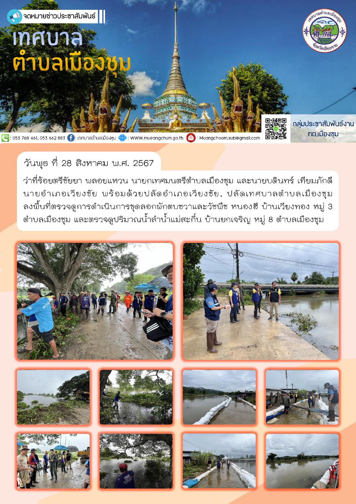 วันพุธ ที่ 28 สิงหาคม พ.ศ. 2567 ว่าที่ร้อยตรีชัยยา พลอยแหวน นายกเทศมนตรีตำบลเมืองชุม และนายบดินทร์ เทียมภักดี นายอำเภอเวียงชัย พร้อมด้วยปลัดอำเภอเวียงชัย, ปลัดเทศบาลตำบลเมืองชุม ลงพื้นที่ตรวจดูการดำเนินการขุดลอกผักตบชวาและวัชพืช หนองฮี บ้านเวียงทอง หมู่ 3 ตำบลเมืองชุม และตรวจดูปริมาณน้ำลำน้ำแม่สะกึ๋น บ้านยกเจริญ หมู่ 8 ตำบลเมืองชุม