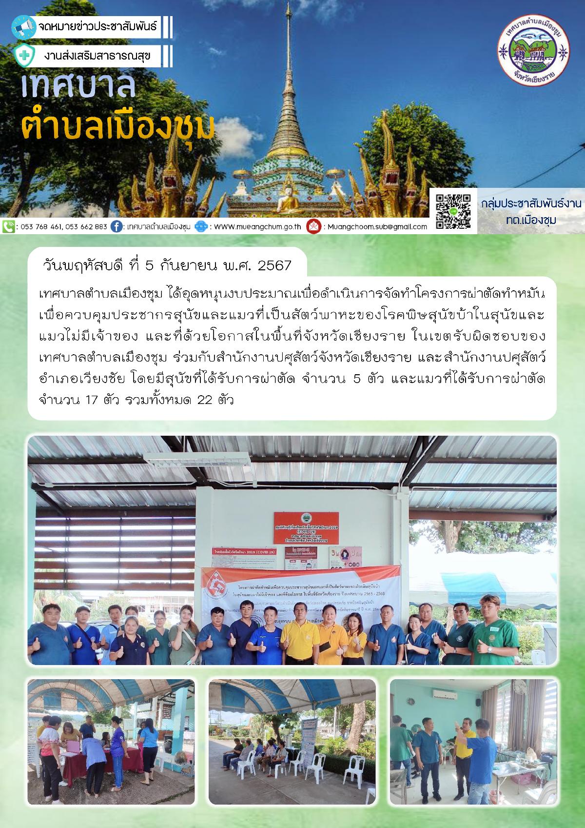 วันพฤหัสบดี ที่ 5 กันยายน พ.ศ. 2567 เทศบาลตำบลเมืองชุม ได้อุดหนุนงบประมาณเพื่อดำเนินการจัดทำโครงการผ่าตัดทำหมันเพื่อควบคุมประชากรสุนัขและแมวที่เป็นสัตว์พาหะของโรคพิษสุนัขบ้าในสุนัขและแมวไม่มีเจ้าของ และที่ด้วยโอกาสในพื้นที่จังหวัดเชียงราย ในเขตรับผิดชอบของเทศบาลตำบลเมืองชุม ร่วมกับสำนักงานปศุสัตว์จังหวัดเชียงราย และสำนักงานปศุสัตว์อำเภอเวียงชัย โดยมีสุนัขที่ได้รับการผ่าตัด จำนวน 5 ตัว และแมวที่ได้รับการผ่าตัด จำนวน 17 ตัว รวมทั้งหมด 22 ตัว