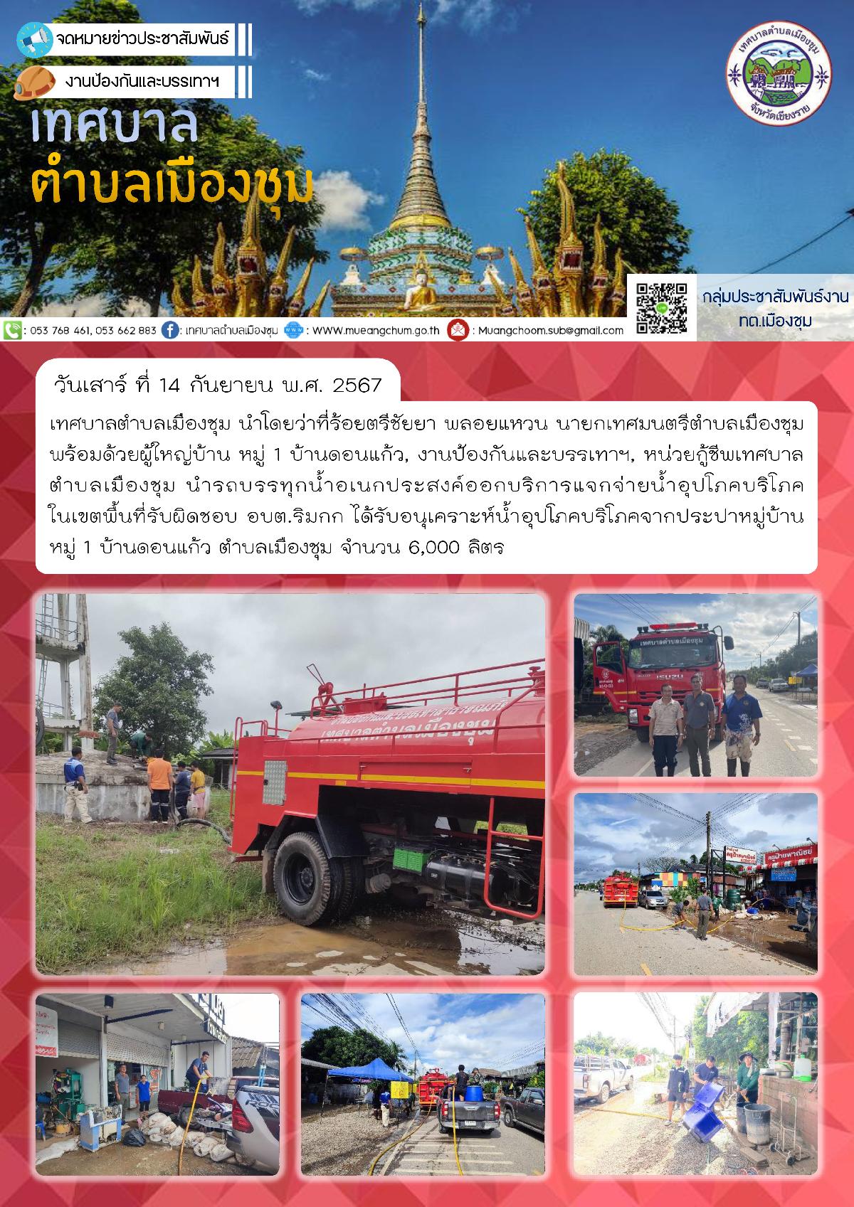 วันเสาร์ ที่ 14 กันยายน พ.ศ. 2567 เทศบาลตำบลเมืองชุม นำโดยว่าที่ร้อยตรีชัยยา พลอยแหวน นายกเทศมนตรีตำบลเมืองชุมพร้อมด้วยผู้ใหญ่บ้าน หมู่ 1 บ้านดอนแก้ว, งานป้องกันและบรรเทาฯ, หน่วยกู้ชีพเทศบาลตำบลเมืองชุม นำรถบรรทุกน้ำอเนกประสงค์ออกบริการแจกจ่ายน้ำอุปโภคบริโภคในเขตพื้นที่รับผิดชอบ อบต.ริมกก ได้รับอนุเคราะห์น้ำอุปโภคบริโภคจากประปาหมู่บ้าน หมู่ 1 บ้านดอนแก้ว ตำบลเมืองชุม จำนวน 6,000 ลิตร