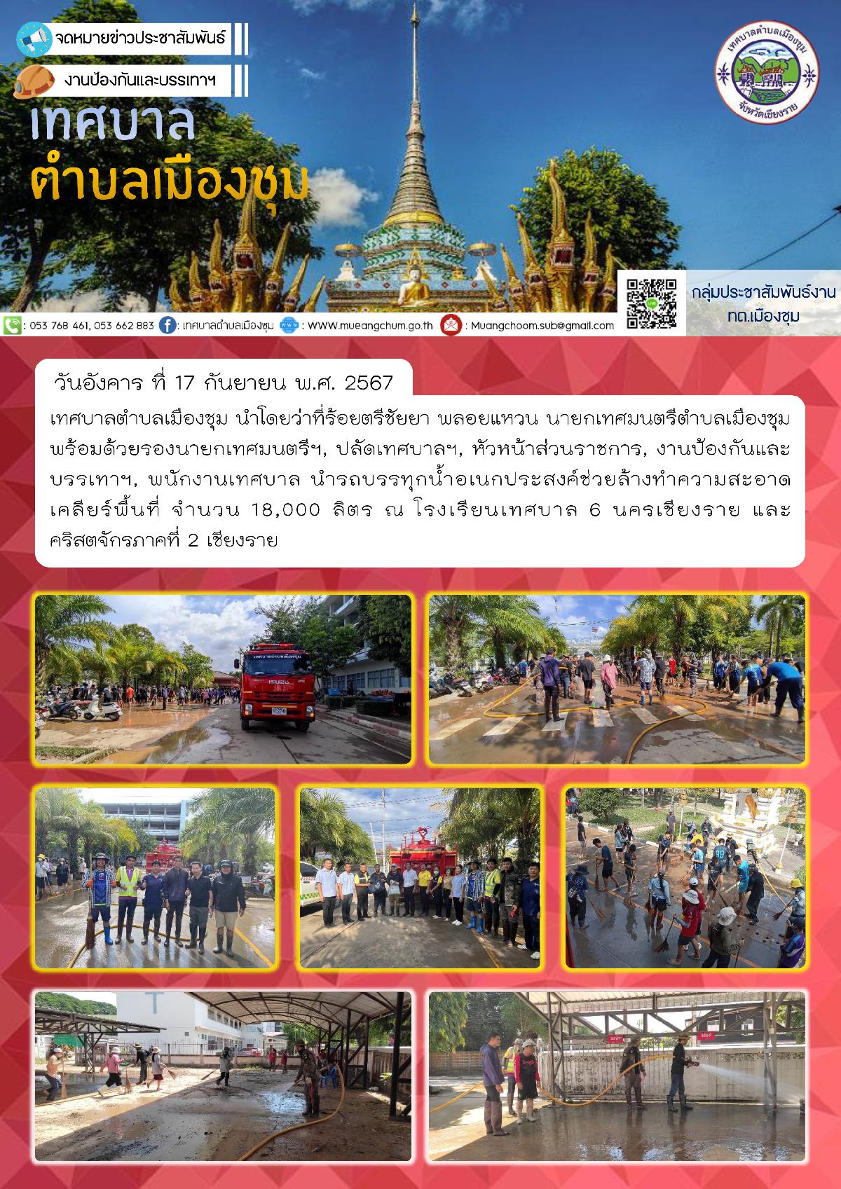 วันอังคาร ที่ 17 กันยายน พ.ศ. 2567 เทศบาลตำบลเมืองชุม นำโดยว่าที่ร้อยตรีชัยยา พลอยแหวน นายกเทศมนตรีตำบลเมืองชุม พร้อมด้วยรองนายกเทศมนตรีฯ, ปลัดเทศบาลฯ, หัวหน้าส่วนราชการ, งานป้องกันและบรรเทาฯ, พนักงานเทศบาล นำรถบรรทุกน้ำอเนกประสงค์ช่วยล้างทำความสะอาดเคลียร์พื้นที่ จำนวน 18,000 ลิตร ณ โรงเรียนเทศบาล 6 นครเชียงราย และคริสตจักรภาคที่ 2 เชียงราย