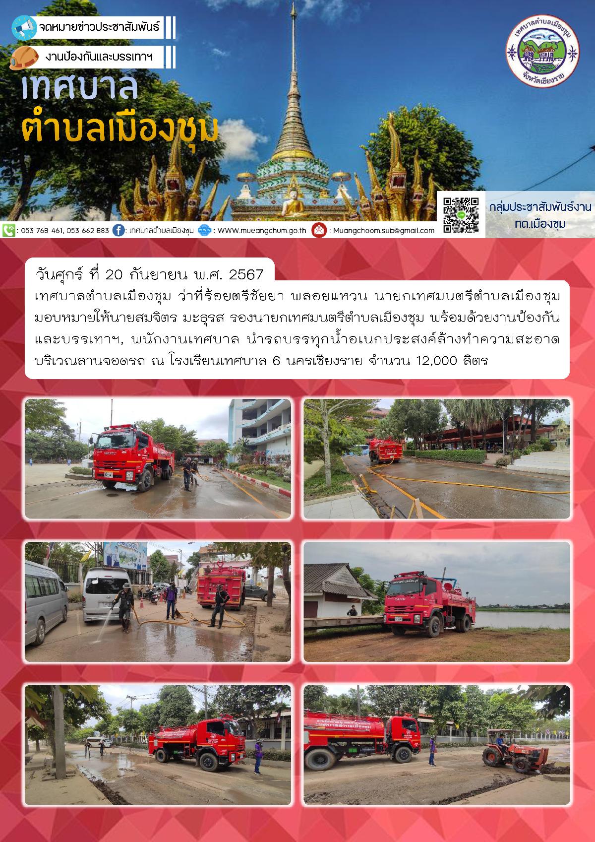 วันศุกร์ ที่ 20 กันยายน พ.ศ. 2567 เทศบาลตำบลเมืองชุม ว่าที่ร้อยตรีชัยยา พลอยแหวน นายกเทศมนตรีตำบลเมืองชุม มอบหมายให้นายสมจิตร มะธุรส รองนายกเทศมนตรีตำบลเมืองชุม พร้อมด้วยงานป้องกันและบรรเทาฯ, พนักงานเทศบาล นำรถบรรทุกน้ำอเนกประสงค์ล้างทำความสะอาดบริเวณลานจอดรถ ณ โรงเรียนเทศบาล 6 นครเชียงราย จำนวน 12,000 ลิตร