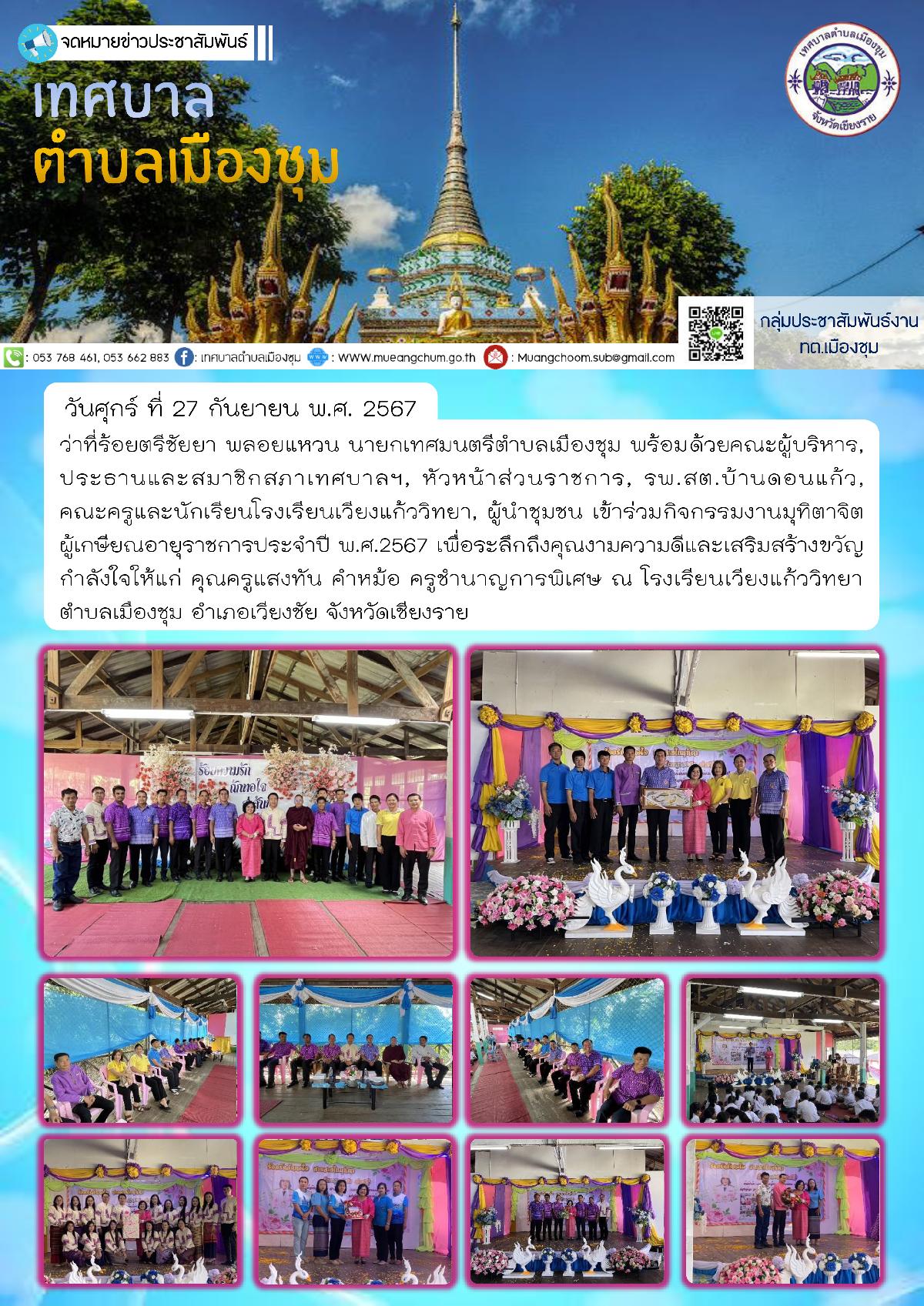 วันศุกร์ ที่ 27 กันยายน พ.ศ. 2567 ว่าที่ร้อยตรีชัยยา พลอยแหวน นายกเทศมนตรีตำบลเมืองชุม พร้อมด้วยคณะผู้บริหาร, ประธานและสมาชิกสภาเทศบาลฯ, หัวหน้าส่วนราชการ, รพ.สต.บ้านดอนแก้ว, คณะครูและนักเรียนโรงเรียนเวียงแก้ววิทยา, ผู้นำชุมชน เข้าร่วมกิจกรรมงานมุทิตาจิตผู้เกษียณอายุราชการประจำปี พ.ศ.2567 เพื่อระลึกถึงคุณงามความดีและเสริมสร้างขวัญกำลังใจให้แก่ คุณครูแสงทัน คำหม้อ ครูชำนาญการพิเศษ ณ โรงเรียนเวียงแก้ววิทยา ตำบลเมืองชุม อำเภอเวียงชัย จังหวัดเชียงราย
