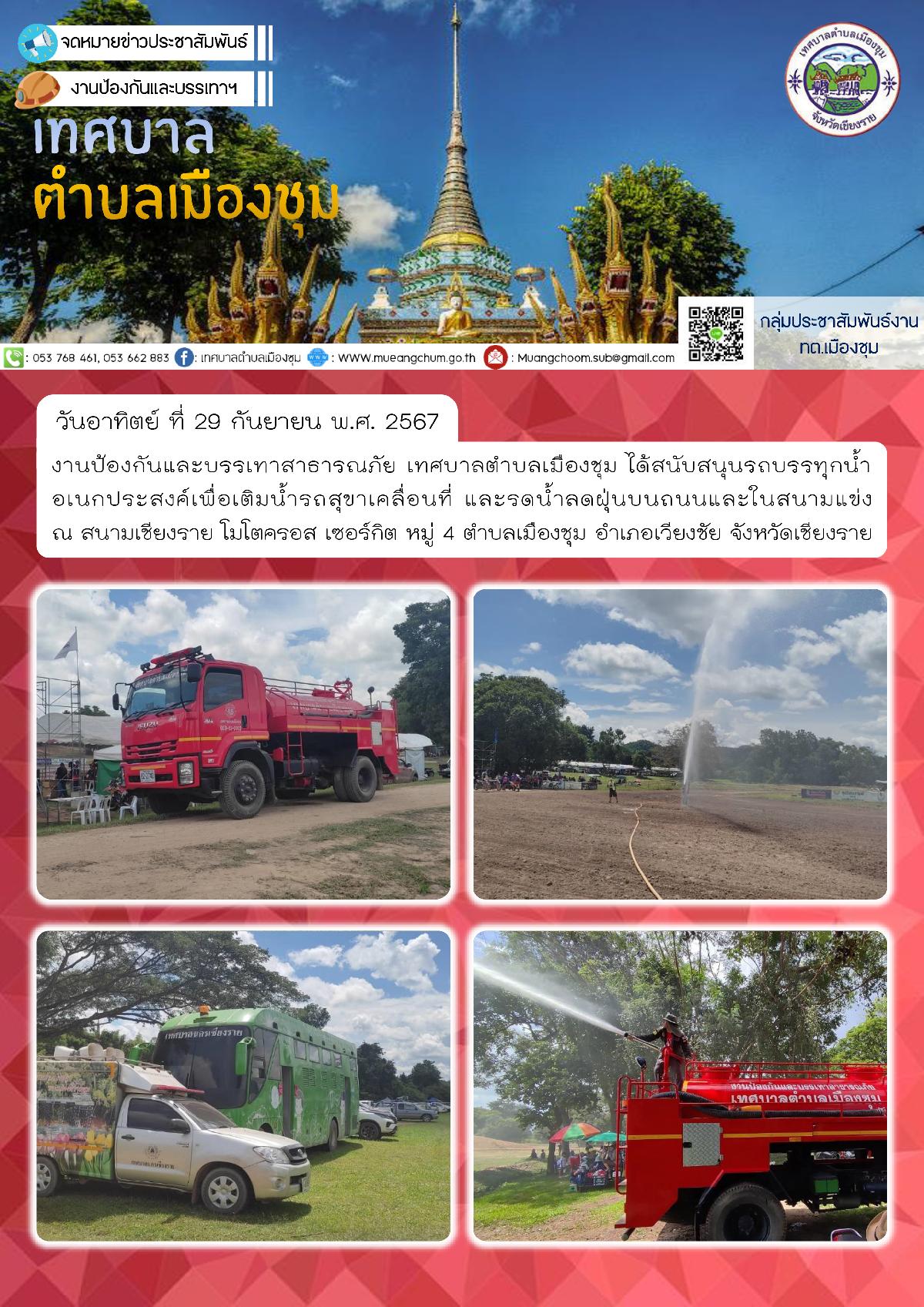 วันอาทิตย์ ที่ 29 กันยายน พ.ศ. 2567 งานป้องกันและบรรเทาสาธารณภัย เทศบาลตำบลเมืองชุม ได้สนับสนุนรถบรรทุกน้ำอเนกประสงค์เพื่อเติมน้ำรถสุขาเคลื่อนที่ และรดน้ำลดฝุ่นบนถนนและในสนามแข่ง ณ สนามเชียงราย โมโตครอส เซอร์กิต หมู่ 4 ตำบลเมืองชุม อำเภอเวียงชัย จังหวัดเชียงราย
